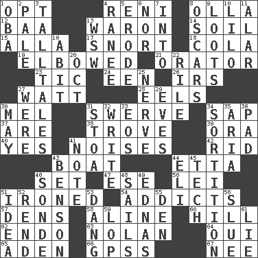 ACROSS 1. Elect 4. Painter Guido (1575-1642) 8. Rounded earthenware pot or jar 12. Sound made by sheep 13. Make _____ (do battle with) 14. The visible part of the earth's surface 15. Silent film actress Nazimova 17. Derisive sound 18. Root beer relative 19. Turned at an angle; bent 21. Speaker 23. Nervous spasm 24. Car or cant ending 26. Big collection agency 27. Electrical Unit 28. Snakelike fish 30. Cartoonist voice _ Blanc 31. Turn aside suddenly 34. Plant excrement 37. "We ___ not amused" (Victoria) 38. Collection of objects 39. Mouth or opening 40. It is so 41. Annoying sounds 42. To free from 43. Water vessel 44. Singer James 46. Put into a specified state 47. Compass dir. 50. Luau accessory 51. Pressed 54. Inveterate users 57. Cub Scout units 58. Place in a line 60. Land elevation 62. Inside; within (prefix) 63. Pitcher Ryan 64. Fr. "Yes" 65. Arabian gulf 66. Global Positioning Systems (abbr.) 67. Born DOWN 1. Chief or king in Benin or Nigeria 2. Diluted with white 3. Baron Munchausen's specialties 4. Indian princess (variant) 5. Eat (away) 6. Not either 7. To the inside or interior of 8. Motion picture awards 9. Plunders 10. _ and Stitch 11. Having or resembling wings 13. Compass dir. 16. "This won't hurt ____!" 20. Sep. follower 22. Cause heat under the collar 25. Effrontery 27. We are 29. Nights before holidays 30. Fifth month 31. Portico 32. Compose 33. Greek goddess of the dawn 34. Conclusion 35. Operatic vocal solo 36. Groovy apt. 41. Make mention of 43. Gillaume's butler role 44. Biblical high priest 45. Georgia ____ (Atlanta school) 46. Something which is sent 48. Moves on water 49. Ferber et al. 51. The main thing one is thinking about 52. Tear apart 53. Mild oath, euphamism for damn 55. Lair 56. Turn sharply 59. Trim (branches) 61. Falsehood