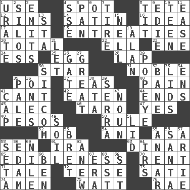 ACROSS 1. Purpose 4. Specific locale 8. False hair 12. Basketball hoops 14. Smooth fabric 16. The main thing one is thinking about 17. Set down 18. Pleas 20. "_____ Recall" 22. Pipe bend 23. Compass dir. 24. Curvy letter 25. Ovum 28. Infant locale 30. Play the lead 31. Having high moral qualities 35. Luau course 37. Afternoon social gatherings 40. Ache 41. Patter 42. Eroded 44. Extremities 45. Actor Baldwin 46. Edible starchy tuberous root 47. It is so 48. Mexican monetary units 50. General guideline 52. Crowd into 54. Black tropical American cuckoo 55. White ___ sheet 58. Elected rep. 61. Lyricist Gershwin 63. Middle Eastern gold or silver currency 65. The property of being fit to eat 70. Monthly bill 71. Story 72. Laconic 73. Suttee (variant) 74. So be it 75. Electrical Unit 76. Actress Charlotte DOWN 1. A salt of uric acid 2. Grain storage towers 3. Sends forth 4. Compass dir. 5. Baking dish 6. Baseball player Mel 7. Become fatigued 8. Teat (slang) 9. Singer Brickell 10. Adolescent 11. Comfort 13. R.R. building 15. 1994 drama film starring Jodie Foster 19. Actor Alda or Thicke 21. Allow 26. Yard entry 27. Relatively large 29. Wimpy's pal 30. "Cheers" or "Ellen" 32. Object of repulsion 33. Hats (slang) 34. Followers of ems 35. Diluted with white 36. Washington bills 38. _ moment's notice (2 wds.) 39. Spanish missionary in California 41. Head covering 43. Part of speech 49. Earth 51. Hat (slang) 53. Cy Young winner Saberhagen 55. Approach 56. Before Barbara or Clara 57. Nick name for Arthur 58. Stalk of a moss capsule 59. Dutch treat 60. The longest river in the world 62. Afresh 64. Big collection agency 66. Benjamin's nick name 67. Epoch 68. Fast jet (abbr.) 69. Arrange properly for use