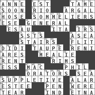 ACROSS 1. Singer Murray 5. Eastern Standard Time (abbr.) 8. Docile 12. Within a short period 13. _ de Janeiro 14. Therefore, facetiously 15. Stockings 16. Wine waiters 19. Compass dir. 20. Commissioned military rank 21. He sold his birthright 23. Call ___ day 24. Big collection agency 27. Fast planes 30. At sea 31. Flight of steps 34. Secret move to avoid paying debts 35. "You Light Up My Life" star Conn 38. Grayish beige 40. Painter Guido (1575-1642) 41. Ancient Greek god of war 42. Ear of corn 44. Monthly bill 45. Basketball hoops 46. Double-curved letter 47. Big _ 50. Silvers or Donahue 53. Speakers 57. Ocean 59. Supplying deficiencies 63. Having or resembling wings 64. First name in cosmetics 65. Animal enclosure 66. We are 67. Separate forcefully 68. Indiana (abbr.) 69. Inactive volcano in Sicily DOWN 1. American tennis player Robert 2. Trap for birds or small mammals 3. Olfactory organs 4. Compass dir. 5. Celtic language 6. The Jewish people; Israel 7. Heavy book 8. Three (prefix) 9. Mature 10. Make imperfect 11. Raised railways 14. Silent film actress Nazimova 17. Medical imaging device (abbr.) 18. Consume 20. Abrupt rush of wind 22. Aid 24. Small island 25. It's straight from the horse's mouth 26. Suttee (variant) 28. Make lace 29. Thailand, formerly 30. Anew 32. Regret 33. Practice fight 35. Have the gumption 36. Angers 37. Hiding places for outlaws 39. Connecticut Ivy Leaguer 43. Naughty children 47. Undercover agent 48. "We ___ not amused" (Victoria) 49. Feline 51. Small island 52. Acquire or gain knowledge or skills 54. Native american tent (variation) 55. Baking chamber 56. Tear apart 58. Length times width 59. Arrange properly for use 60. Purpose 61. Parent Teacher Association (abbr.) 62. For each 63. Deep reverence