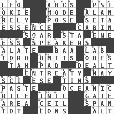 ACROSS 1. Lion 4. Lettered men learn these first 8. 23rd letter of the Greek alphabet 11. Migrant worker of the '30s 13. Method 14. ____ Jay Lerner 15. Have confidence or faith in 16. Introduce or present, as a question 17. Bristle 18. Core 21. Small house or cottage 22. Fly high 23. R.R. building 25. Compass dir. 26. Curvy letter 29. Orators 32. Having winglike extensions 34. Sound made by sheep 35. Experiment locale 38. "Corrida" creature 39. Leaves out 41. Lyric poems 43. Scottish cap 44. Writing tablet 45. Started a card game 46. Plea 50. Can I? 51. _-fi 54. Compass dir. 55. Metal containers 57. Thick mixture 59. Pertaining to the sea 63. Cause heat under the collar 64. International (abbr.) 67. Yard entry 68. Type of rug 69. To provide with a ceiling 70. Connect, as a bridge 71. Small child 72. Immeasurably long periods of time 73. Keyboard modifier key DOWN 1. Old wives' tales, e.g. 2. Supplements with great effort 3. Lubricates 4. Electrical Unit 5. Surprise greeting 6. Music discs 7. Perceive with the eye 8. Cadet 9. Smooth fabric 10. Empty; void 12. Snake ____ (dice throw) 14. White ___ sheet 19. Characteristic smell of wine 20. Head covering 21. Automobile 23. Three-handed card game 24. Afternoon social gatherings 26. Ingest 27. Narrow opening 28. "Two Mules for Sister ____" 30. Stay 31. _ gin 33. Heavy book 36. First of billions? 37. Actor Lugosi 39. Chooses 40. Female horse 42. Filthy place 45. Centimeter-gram-second unit of force 47. Born 48. Ringlike coral islands and reefs 49. Nervous spasm 51. Small fatty European fish 52. Capital of Egypt 53. Small island 56. Droops 58. Beverage made from leaves 60. California wine valley 61. Slanted text style (abbr.) 62. Penny 64. Frozen water 65. Modern: prefix 66. Metal container