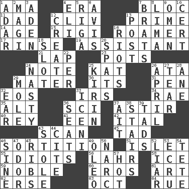 ACROSS 1. Wet nurse (var.) 4. Period 7. Group of countries in special alliance 11. Male parent 12. 154 in Roman numerals 13. First class 14. Ripen 15. Swiss mountan, "Queen of the Mountains" 16. Nomad 17. Remove soap 19. Aide 21. Infant locale 23. Cooking vessels 24. Brief written record 25. Krazy ___ of comics 26. "One Day ___ Time" 29. Mother 30. ___ a Wonderful Life 31. Animal enclosure 32. Greek goddess of the dawn 33. Big collection agency 34. Actress Charlotte 35. The first octave above the treble staff 36. _-fi 37. Moving about 40. Marina Del _, California 41. Car or cant ending 42. Slanted text style (abbr.) 43. Skim 45. Small boy 46. Casting lots 51. Small island 55. Foolish or stupid persons 56. Cowardly lion portrayer 58. Frozen water 59. Impressive in appearance 60. Greek god of love 61. Tate display 62. Celtic language 63. Sep. follower 64. Regret DOWN 1. The sixth month of the Jewish calendar 2. Wise men 3. An important port of Yemen 4. Connecticut Ivy Leaguer 5. Capital of Latvia 6. Deliberation 7. Naughty children 8. Pale green bean 9. Presage 10. Sure thing 12. Cause to be 13. Mail 16. Debaucheries 18. Slit 20. Arguments over trivial matters 22. For each 24. Characterized by obscenity 25. Japanese brewing company 26. Showery time 27. Pull apart 28. One (Scot) 29. Undercover agent 32. Hearing organ 33. Ancient Celtic tribe of eastern Britain 36. Theater features 37. Small island 38. Flight of steps 39. Small amounts or degrees 43. Fur scarf 44. Quote 46. Trig term 47. Aroma 48. Chest bones 49. Butter sub 50. Drug cop 52. One who doesn't tell the truth 53. Shade of tan 54. Wig 57. Being at a high temperature