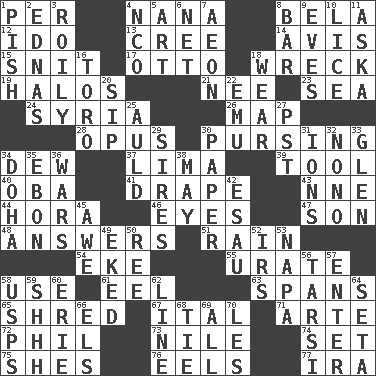 ACROSS 1. For each 4. Nanny 8. Actor Lugosi 12. Wedding promise 13. Algonquian 14. Advice 15. In a ____ (agitated or irritated) 17. Von Bismarck 18. Raze 19. Radiant circles of light 21. Born 23. Ocean 24. Damascus' land 26. Atlas unit 28. Musical composition 30. Puckering 34. Morning condensation 37. Pale green bean 39. Instrument 40. Chief or king in Benin or Nigeria 41. Window treatment 43. Compass dir. 44. Israeli folk dance 46. Sight organs 47. Manchild 48. Responds (to) 51. Precipitation 54. Supplement with great effort 55. A salt of uric acid 58. Purpose 61. Snakelike fish 63. Connects, as a bridge 65. Fragment 67. Slanted text style (abbr.) 71. Johnson of "Laugh-In" 72. Silvers or Donahue 73. Mediterranean tributary 74. Put into a specified state 75. "______ My Girl" (Turtles hit) 76. Snakelike fish 77. Lyricist Gershwin DOWN 1. Expression of disdain 2. Ferber et al. 3. Agitated, as a liquid 4. Non-commissioned officer (abbr.) 5. Nonscientific branch of learning 6. Remaining after all deductions 7. Period of immesurable duration 8. Tavern 9. Nights before holidays 10. Louse (plural) 11. "____ silly question..." 16. "Corrida" creature 18. Put on (as clothing) 20. Small drink 22. Australian flightless bird 25. Old (Scot.) 27. Pacific Standard Time (abbr.) 29. Begets 30. Some stationery 31. Charged atoms 32. Words to Nanette 33. Small, secluded valley 34. Capital of the state of Qatar 35. Inky black, to poets 36. Armed conflicts 38. Fifth month 42. Son of Isaac 45. Deep reverence 49. Supplemented with great effort 50. To sift 52. Big collection agency 53. California wine valley 56. Tarsus (plural) 57. Keyboard key 58. United States Postal Service (abbr.) 59. Quiet! 60. One of the Great Lakes 62. Actor's bit 64. Stalk of a moss capsule 66. Raised railways 68. Make a knot 69. Everything 70. French article