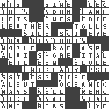 ACROSS 1. Mountains (abbr.) 4. The founder of a family 8. Part of a journey 11. Angers 13. Part of speech 14. Unable to walk 15. Allows 16. Washington bills 17. Singer Brickell 18. Cordwainer's material 21. For Whom the Bell _____ 22. Drop; flow; fall 23. _-fi 25. Sight organ 26. Retirement account (abbr.) 29. What propaganda does 32. Having high moral qualities 34. Actress Charlotte 35. Cleo's killer 38. Jai _ 39. Dinah or Pauly 41. Slanted text style (abbr.) 43. And so on (abbr.) 44. Car or cant ending 45. Learning spot: Fr. 46. Plea 50. Air pressure measure (abbr.) 51. Fast jet (abbr.) 54. Double-curved letter 55. Become fatigued 57. Native American of Southwest Alaska 59. Pertaining to the sea 63. Negative votes 64. Not ill 67. San ____ (Riviera town) 68. Periodic rise and fall of the sea level 69. Of or related to the anus 70. Narrow board 71. One (Scot) 72. Confederate soldiers (slang) 73. Potassium hydroxide DOWN 1. Place where flour is made 2. Family _ (genealogy) 3. Bristle 4. Sounds asleep 5. Electrically charged atom 6. Sorrow 7. Followers of ems 8. Dipping utensil 9. Poet Dickinson 10. Honkers 12. Fast planes 14. Lion 19. Flintstone garb 20. Biblical high priest 21. Teat (slang) 23. Fly high 24. Algonquian 26. _ tizzy (2 wds.) 27. Hero or heavy, e.g. 28. Blind as ____ 30. Heavy duty weighing machine 31. Ketch in the Levant 33. Louse (plural) 36. Halt 37. Friends 39. Puts into a specified state 40. Possessive pronoun 42. Flowery wreath 45. Jane of fiction 47. Remaining after all deductions 48. Ringlike coral islands and reefs 49. Nervous spasm 51. Before Barbara or Clara 52. Killed 53. Miss Universe 1986, Barbara Palacios _ 56. Hearing organs 58. Purpose 60. 1994 drama film starring Jodie Foster 61. "If ____ say so..." 62. ____ d'Azur (French Riviera) 64. Armed conflict 65. Compass dir. 66. Experiment locale