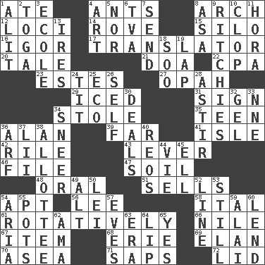 ACROSS 1. Had dinner 4. Pismires 8. Bowlike part 12. Event scenes 14. Be footloose 15. Grain storage tower 16. Russian composer Stravinsky 17. Interpreter 20. Story 21. ___ good deed 22. Accounting whiz (abbr.) 23. _____ Park, CO 27. Brightly colored fish 29. On the rocks 31. Omen 34. Fur scarf 35. Adolescent 36. ____ Jay Lerner 39. At a great distance 41. Capri or Wight 42. Cause heat under the collar 43. Crowbar 46. Do some clerical work 47. Land 48. Spoken 51. Makes a sale 54. Fitting 56. Area sheltered from the wind 58. Slanted text style (abbr.) 61. Rotating or pertaining to rotation 66. Mediterranean tributary 67. A distinct part 68. 4th largest of the Great Lakes 69. Liveliness 70. At sea 71. Plant excrements 72. Hat (slang) DOWN 1. Came down and settled, as after flight 2. Ancient Roman robe 3. Learning spot: Fr. 4. Nonscientific branch of learning 5. Not either 6. Federal power corp. 7. Transmit 8. White ___ sheet 9. Actors Guy, Robert Welles, and Clint 10. Hoof sound 11. Israeli folk dance 13. Angers 18. "Barney Miller" actor Jack 19. Infant locale 24. Teat (slang) 25. Environmental prefix 26. Automatically 28. Being in motion 30. Allots cards 32. Set 33. Compass dir. 34. Contemptuous expression 36. Sandy's bark 37. Cards in a Roman deck? 38. One to whom something is allotted 40. Vintage cars 44. Compete 45. Pipe bend 49. The first octave above the treble staff 50. Flowery wreath 52. Actor's bit 53. Free from disturbance or agitation 54. Roberta Peters solo 55. Plant holders 57. Nights before holidays 59. Jai ____ 60. Grant temporary use of 62. Nursemaid (var.) 63. Epoch 64. Mouth edge 65. Affirmative reply