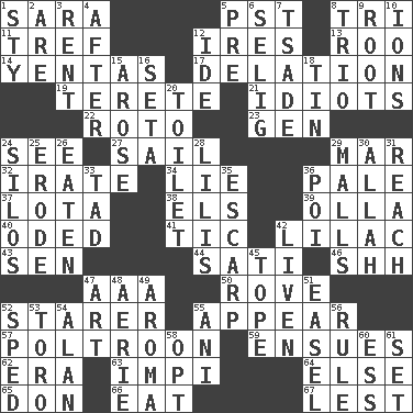 ACROSS 1. "Two Mules for Sister ____" 5. Pacific Standard Time (abbr.) 8. Three (prefix) 11. Not kosher 12. Angers 13. Friend of Pooh 14. Gossips 17. Conveyance 19. Cylindrical with tapered ends 21. Foolish or stupid persons 22. Printing process, for short 23. Commissioned mil. rank 24. Observe 27. Move on water 29. Spoil 32. Feeling or showing extreme anger 34. Whopper 36. Light colored 37. Globular water bottle used in Asia 38. Raised railways 39. Water jar 40. Wrote a lyric poem 41. Nervous spasm 42. Pale purple color 43. Elected rep. 44. Suttee (variant) 46. Quiet! 47. American Automobile Association (abbr.) 50. Be footloose 52. A viewer who gazes fixedly 55. Seem 57. Coward 59. Follows as a consequence or result 62. Period 63. Body of Kaffir warriors 64. Otherwise 65. Spanish title 66. Ingest 67. For fear that DOWN 1. Filthy place 2. "We ___ not amused" (Victoria) 3. Monthly bill 4. Following 5. Before (prefix) 6. Major League Baseball Commissioner Bud 7. Sadhe (variant) 8. Musical group of three 9. Carrot, for example 10. Charged particles 12. Binary compound 15. Came up 16. Stalk of a moss capsule 18. Shallow baking pan 20. Rest room 24. Grain storage towers 25. Eat (away) 26. Eroded 28. Ms. Damita and namesakes 29. Promenades 30. Assad's deity 31. Arrive at 33. Small boy 35. Fortification 36. Luau course 42. Make or become more lively 45. Drink excessively 47. Tate display 48. Nest on high 49. Odor 51. Artist's stand 52. Moved rapidly 53. "Corrida" creature 54. ____ Jay Lerner 55. Cuckoo 56. Court order 58. Elect 60. Double-curved letter 61. Arrange properly for use