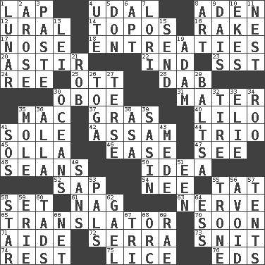 ACROSS 1. Pet locale 4. Freehold land 8. An important port of Yemen 12. Mountain range 14. Literary convention 16. Immoral or dissolute person 17. Characteristic smell of wine 18. Pleas 20. Moving or stirring 22. Indiana (abbr.) 23. Fast jet (abbr.) 24. To riddle 25. Baseball player Mel 28. Small moist lump or mass 30. Mitch Miller's instrument 31. Mother 35. Apple computer (short form) 37. Pate de foie ____ 40. _ and Stitch 41. Not divided or shared with others 42. Indian state 44. Musical group of three 45. Water jar 46. Comfort 47. Perceive with the eye 48. Actors Connery and Penn 50. It may be bright or harebrained 52. Plant excrement 54. Born 55. Make lace 58. Put into a specified state 61. Tired old horse 63. Impudent aggressiveness 65. Interpreter 70. Within a short period 71. Assistant 72. Spanish missionary in California 73. In a ____ (agitated or irritated) 74. Remainder 75. Louse (plural) 76. Begley and Asner DOWN 1. Type of eclipse 2. Came up 3. Thick mixture 4. Shoshoni 5. Spanish title 6. Fitting 7. Australian parrot (variant) 8. Nonscientific branch of learning 9. Raised platform 10. Supplements with great effort 11. Egg locale 13. Flowery wreath 15. Post 19. First of billions? 21. Director Reiner 26. Ancient Roman robe 27. Laconic 29. Greek mezzo-soprano Agnes 30. Seas 32. Hoop that covers a wheel 33. Writer Wiesel 34. Friend of Pooh 35. Undercover agent 36. Silent film actress Nazimova 38. White ___ sheet 39. Indian antelope 41. Distress signal 43. Ancient Persian 49. Without 51. Car or cant ending 53. Friends 55. Marketplace scale 56. Stay clear from 57. Portable shelters 58. Play the lead 59. One of the Great Lakes 60. Bits 62. Highlander 64. Double-curved letter 66. Remaining after all deductions 67. Three (prefix) 68. The grampus (Milton) 69. Actress Charlotte