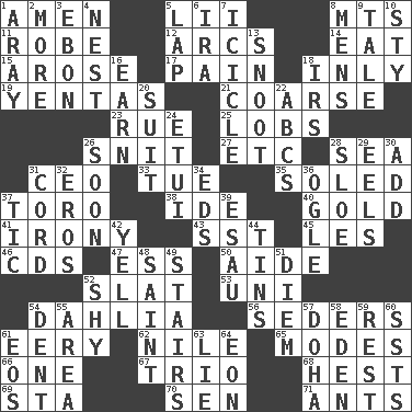 ACROSS 1. So be it 5. Cards in a Roman deck? 8. Mountains (abbr.) 11. Loose flowing garment 12. Arches 14. Ingest 15. Came up 17. Ache 18. In an inward manner 19. Gossips 21. Rough 23. Regret 25. Tennis shots 26. In a ____ (agitated or irritated) 27. And so on (abbr.) 28. Ocean 31. Corporate head (abbr.) 33. Third day of the wk. 35. Having a sole or soles 37. "Corrida" creature 38. Binary compound 40. Aureate 41. Literary sarcasm 43. Fast jet (abbr.) 45. French article 46. Music discs 47. Double-curved letter 50. Assistant 52. Narrow board 53. Single; one (prefix) 54. Mexican or Central American flower 56. Spring feasts 61. Suggestive of the supernatural 62. The longest river in the world 65. Methods 66. Single 67. Musical group of three 68. Behest 69. R.R. building 70. Elected rep. 71. Pismires DOWN 1. Like ___ of sunshine 2. Greater amount 3. Inky black, to poets 4. A home for chicks 5. Pet locale 6. Retirement account (abbr.) 7. Hanging ice 8. Not women's 9. Story 10. Filthy place 13. Snob 16. Merit 18. Big collection agency 20. Set of matching outer garments 22. Lettered men learn these first 24. Needle holder 26. Within a short period 28. _ gin 29. Snakelike fish 30. Find the sum of 31. Drawstring 32. Greek god of love 34. Begley and Asner 36. Stare at amorously 37. Nervous spasm 39. Son of Isaac 42. Shout 44. Canisters 48. Virtuous person 49. Flight of steps 51. South Vietnam president (1954) 52. Like a shrinking violet 54. Gouge 55. Type of rug 57. Capital of the state of Qatar 58. Genesis locale 59. Respite 60. Fast planes 61. Greek goddess of the dawn 63. Falsehood 64. Period of immesurable duration