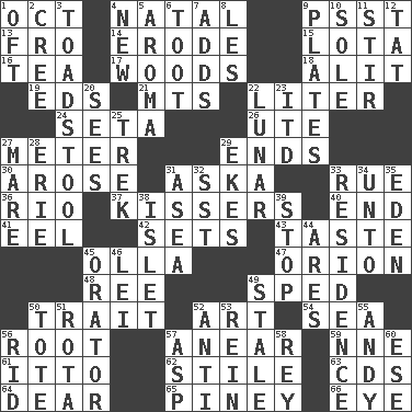 ACROSS 1. Sep. follower 4. Brizilian seaport 9. Inconspicuous attention getter 13. From 14. Wear away 15. Globular water bottle used in Asia 16. Beverage made from leaves 17. Forest 18. Came down and settled, as after flight 19. Begley and Asner 21. Mountains (abbr.) 22. 61 cubic inches 24. Bristle 26. Shoshoni 27. Distance measurement 29. Conclusions 30. Came up 31. "____ silly question..." 33. Regret 36. River (Sp.) 37. Smoochers 40. Conclude 41. Snakelike fish 42. Arranges properly for use 43. Clothes sense 45. Water jar 47. Constellation of myth 48. Portuguese money of account (variant) 49. Hurried 50. Distinguishing feature 52. Tate display 54. Ocean 56. Carrot, for example 57. Approach 59. Compass dir. 61. "Tell ____ the Marines!" 62. Vertical member of a panel or frame 63. Music discs 64. Letter starter 65. Abounding in pines 66. Sight organ DOWN 1. Often (poetically) 2. Algonquian 3. Inedible or poisonous agaric 4. ___ Haven, CT 5. Odor 6. A blast of a horn 7. Does sums 8. French article 9. Food holders 10. Not divided or shared with others 11. Use a swizzle stick 12. Make lace 20. Perceives with the eye 22. Type of eclipse 23. It would 25. Long journey 27. Female horse 28. 4th largest of the Great Lakes 29. Makes supply last 31. At sea 32. Fast jet (abbr.) 33. Dwelling 34. To (old English) 35. Locale of original sin 38. Small island 39. Obstruct or block passage 44. Ancient Greek god of war 45. Speaker 46. Flowery wreath 49. Showing deterioration from age 50. Haul 51. Roll call or roster of names 52. Opposed to 53. It's straight from the horse's mouth 55. "60 Minutes" Commentator Rooney 56. To free from 57. Cleo's killer 58. Marina Del _, California 60. Compass dir.