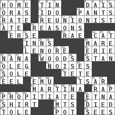ACROSS 1. Residence 5. Shallow baking pan 8. Raised platform 12. Mouths or openings 13. Wedding promise 14. Leg coverings 15. Pace 16. One who advocates reunion 19. Had dinner 20. Thinks logically 21. Celtic language 23. Actress Charlotte 24. Feline 27. Lodging establishments 30. Female horse 31. Poe poem 34. 4th largest of the Great Lakes 35. Grandmother 38. Forest 40. Comedian Laurel of Laurel & Hardy 41. Cassini of fashion 42. Annoying sounds 44. Flatfish 45. False hair 46. Snakelike fish 47. Australian flightless bird 50. Russian ruler of old 53. Chrissie's court nemesis 57. Reproach for some lapse or misdeed 59. Appease 63. Inactive volcano in Sicily 64. Upper-body garment 65. Mountains (abbr.) 66. Passed on 67. Lacquered or enameled metalware 68. Cooking vessel 69. Perceives with the eye DOWN 1. Israeli folk dance 2. Speak pompously 3. Mother 4. Compass dir. 5. Hoop that covers a wheel 6. The main thing one is thinking about 7. Horse sense 8. Daniel's nick name 9. Black tropical American cuckoo 10. ___ a Wonderful Life 11. Fast jet (abbr.) 14. Airs 17. Not either 18. _ tizzy (2 wds.) 20. French philosopher Descartes 22. Fodder prepared in a silo 24. Haul 25. Roberta Peters solo 26. Adolescent 28. Compass dir. 29. Within a short period 30. Makes clutter 32. Friend of Pooh 33. Prepare for publication 35. Olfactory organ 36. _ vera 37. 1994 drama film starring Jodie Foster 39. Compass dir. 43. Singer James 47. Send forth 48. Floor covering 49. RI univ. 51. Nick name for Arthur 52. Indian princess (variant) 54. Pack (down) 55. "Tell ____ the Marines!" 56. Egg locale 58. Groovy apts. 59. Pacific Standard Time (abbr.) 60. 17th letter of the Greek alphabet 61. Lubricate 62. Before (prefix) 63. Begley and Asner