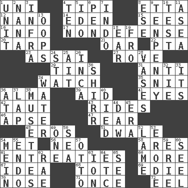 ACROSS 1. Single; one (prefix) 4. Native american tent (variation) 8. Singer James 12. Billionth: prefix 14. Locale of original sin 15. Observes 16. A message received and understood 17. Unrelated to defense, as in spending 20. Canvas cover 21. Rowing implement 22. Parent Teacher Association (abbr.) 23. Slender Brazilian palm 27. Be footloose 29. Canisters 31. Against 34. Timepiece 35. In a ____ (agitated or irritated) 36. _ mater 39. Assist 41. Sight organs 42. Strained 43. Amusement-park features 46. Domed church section 47. Tail end 48. Greek god of love 51. A sleeping potion; an opiate (poet.) 54. Was introduced to 56. Modern: prefix 58. Ancient Greek god of war 61. Pleas 66. Greater amount 67. It may be bright or harebrained 68. Haul 69. Singer Brickell 70. Sense of smell 71. Single time 72. Snakelike fish DOWN 1. A single undivided whole 2. Grandmother 3. Kind of red light 4. "___ Little Indians" 5. Wedding promise 6. Fenced enclosure 7. _ china 8. Compass dir. 9. 3-inch nail 10. Trial 11. Toward the sea 13. I made a mistake 18. Hearing organ 19. Away 24. R.R. building 25. Small island 26. South American Indian 28. Flower holders 30. Bake eggs in their shells 32. Make a knot 33. ___ a Wonderful Life 34. Wetness 36. "One Day ___ Time" 37. Infant locale 38. French bagpipes 40. Passed on 44. Fool 45. Epoch 49. Single 50. Ocean 52. Unable to walk 53. Eat (away) 54. Count _ (2 wds.) 55. Inside; within (prefix) 57. "Beetle Bailey" pooch 59. 4th largest of the Great Lakes 60. Sew up the eyelids of hawks and falcons 62. Actress Charlotte 63. Electrically charged atom 64. And so on (abbr.) 65. Perceive with the eye