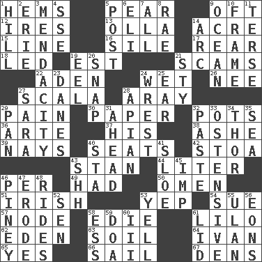 ACROSS 1. Equivocates 5. Lightbulb-shaped fruit 9. Often (poetically) 12. Angers 13. Rounded earthenware pot or jar 14. 43,560 square feet 15. Actor's bit 16. Filth; sediment 17. Tail end 18. Directed 19. Eastern Standard Time (abbr.) 21. Fraudulent business schemes 22. An important port of Yemen 24. Dripping 26. Born 27. Any of the three canals of the cochlea 28. Like ___ of sunshine 29. Ache 30. Some stationery 32. Cooking vessels 36. Johnson of "Laugh-In" 37. Part of HMS, perhaps 38. American tennis player Robert 39. Negative votes 40. Theater features 42. Portico 43. Comedian Laurel of Laurel & Hardy 44. 61 cubic inches 46. For each 49. Possessed 50. Sign of things to come 51. From or relating to Ireland 53. Slangy assent 54. Institute legal proceedings 57. Connecting point 58. Singer Brickell 61. _ and Stitch 62. Paradise 63. Earth 64. _ the terrible 65. It is so 66. Move on water 67. Hiding places for outlaws DOWN 1. Land elevation 2. One of the Great Lakes 3. Ananias' fault 4. Compass dir. 5. Mail 6. Connecticut Ivy Leaguer 7. Everything 8. Actress Charlotte 9. Sea 10. Movie unit 11. Laconic 14. Curve 19. Snakelike fish 20. Fastener 21. Filthy place 23. Natives or inhabitants of Denmark 24. Obtain by seizing forcibly or violently 25. Hearing organ 27. "Two Mules for Sister ____" 28. Bee-related 29. Baking dish 31. Forward in time 32. Thick mixture 33. Clearly or manifestly demonstrative 34. Son of Odin 35. Ocean 40. R.R. building 41. A type of plum 43. Quiet! 45. Mischievous child 46. Abounding in pines 47. Wear away 48. Amusement-park features 52. Elected rep. 53. Shout 55. ____ Bator, Mongolia 56. Immeasurably long periods of time 58. Curvy letter 59. ___ good deed 60. One more than two 61. Flaplike covering