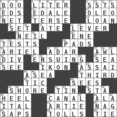 ACROSS 1. Oct. 31 cry 4. 61 cubic inches 9. Fast planes 13. Begley and Asner 14. Peak District village in England 15. Margarine 16. Remaining after all deductions 17. Laconic 18. Grant temporary use of 19. Arrange properly for use 21. Had dinner 22. Prying instrument 24. Famous astronaut Armstrong 26. Compass dir. 27. Trials 29. Writing tablets 30. Satellite of Uranus 31. The sixth month of the Jewish calendar 33. Leather borer 36. HTML Container Element 37. Taking place subsequently 40. Ocean 41. Perceive with the eye 42. Visual representation of an object 43. Slender Brazilian palm 45. Toward the sea 47. One of three equal parts 48. Nervous spasm 49. Observes 50. Dinah or Pauly 52. Shallow baking pan 54. R.R. building 56. The bottom of a shoe or boot 57. Lessep's creation 59. According to 61. Slanted text style (abbr.) 62. Nick name for Arthur 63. Tired old horse 64. Plant excrements 65. For Whom the Bell _____ 66. Neckwear DOWN 1. Benjamin's nick name 2. Lyric poems 3. Clearly or manifestly demonstrative 4. Allow 5. Perfect 6. Small pie 7. Otherwise 8. To riddle 9. Finds the solution 10. A type of plum 11. Rend 12. Male offspring 20. False hair 22. Memorize 23. Conclude 25. Small island 27. Small amounts or degrees 28. One of the Great Lakes 29. Ache 31. "____ silly question..." 32. Superhero pair 33. Helper 34. Erode 35. Put down 38. Sibling's daughter 39. Yard entry 44. "______ My Girl" (Turtles hit) 45. Ringlike coral islands and reefs 46. Title for a knight 49. Slow-paced one 50. Stalk of a moss capsule 51. Pile 52. Pacific island yam 53. International (abbr.) 55. Jai _ 56. Part of HMS, perhaps 57. Domesticated feline 58. French article 60. Ripen