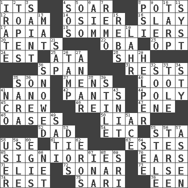 ACROSS 1. It is 4. Fly high 8. Plant holders 12. Wander aimlessly 14. Flexible twig of a willow tree 16. Kill 17. Capital of Western Samoa 18. Wine waiters 20. Portable shelters 22. Chief or king in Benin or Nigeria 23. Elect 24. Eastern Standard Time (abbr.) 25. _ moment's notice (2 wds.) 28. Quiet! 30. Connect, as a bridge 31. Musical pauses 35. Male child 37. Not women's 40. Spoils 41. Billionth: prefix 42. Leg coverings 44. Much (prefix) 45. Group working together 46. It's straight from the horse's mouth 47. Compass dir. 48. Fertile tracts in a desert 50. One who doesn't tell the truth 52. June honoree 54. And so on (abbr.) 55. R.R. building 58. Purpose 61. Standoff 63. _____ Park, CO 65. Seigniories (variant) 70. Hearing organs 71. Writer Wiesel 72. Underwater navigation system 73. Otherwise 74. Relief 75. Indian skirt 76. Car or cant ending DOWN 1. Feeling or showing extreme anger 2. Drinks excessively 3. Virtuous person 4. Mayday 5. Bear (Spanish) 6. Direct toward a target or goal 7. San ____ (Riviera town) 8. Air pressure measure (abbr.) 9. Margarine 10. Canvas cover 11. System (abbr.) 13. Floor covering 15. Confederate soldiers (slang) 19. Cowardly lion portrayer 21. Plant excrement 26. Pack (down) 27. Approach 29. Aide 30. Frozen precipiation fell 32. Within a short period 33. Lacquered or enameled metalware 34. Filthy place 35. "Two Mules for Sister ____" 36. Singles 38. Compass dir. 39. Vertical member of a panel or frame 41. Non-commissioned officer (abbr.) 43. In a ____ (agitated or irritated) 49. Suttee (variant) 51. Adept person 53. "Vaya con ____" 55. Showing deterioration from age 56. Laconic 57. NE Netherlands city 58. One who uses or employs something 59. Drop; flow; fall 60. The front part of a cuirass 62. Greek god of love 64. Observe 66. Remaining after all deductions 67. _ tizzy (2 wds.) 68. Ewer handle 69. _ Lanka