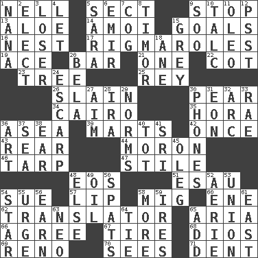 ACROSS 1. 1994 drama film starring Jodie Foster 5. Religious group 9. Obstruct or block passage 13. _ vera 14. Mine, in Marseilles 15. Purposes of endeavors 16. Egg locale 17. Frustrating wastes of time 19. Adept person 20. Oblong piece of solid material 21. Single 22. Small bed 23. Family _ (genealogy) 25. Marina Del _, California 26. Killed 30. Lightbulb-shaped fruit 34. Capital of Egypt 35. Israeli folk dance 36. Toward the sea 39. Shops 42. At one time in the past 43. Located in or toward the back 44. Person of subnormal intelligence 46. Canvas cover 47. Vertical member of a panel or frame 48. Greek goddess of the dawn 51. He sold his birthright 54. Take to court 57. Mouth edge 58. Russian fighter aircraft 60. Compass dir. 62. Interpreter 65. Operatic vocal solo 66. Match 67. Hoop that covers a wheel 68. "Vaya con ____" 69. Former U.S. Attorney General Janet 70. Observes 71. Undesirable depression on a surface DOWN 1. Nanny 2. Opt 3. Failure 4. Allow 5. "Two Mules for Sister ____" 6. Independent ruler or chieftain 7. Gear tooth 8. The easternmost of the Lesser Sundas 9. "Barney Miller" actor Jack 10. Baby powder 11. Margarine 12. Inconspicuous attention getter 15. Jennifer or Joel 18. One (Scot) 20. Actor Lugosi 24. Fortification 27. Direct toward a target or goal 28. Lyricist Gershwin 29. Typical models 30. Gives a jingle 31. Period of immesurable duration 32. Curve 33. Actress Charlotte 36. Tate display 37. Ocean 38. Hearing organ 40. Small child 41. _ Lanka 45. Cassini of fashion 48. Otherwise 49. Petroleum 50. Arguments over trivial matters 52. Nest on high 53. The state of being joined or united 54. Play the lead 55. Goad 56. Merit 58. Greater amount 59. Angers 61. Compass direction 63. Modern: prefix 64. Make a knot 65. Find the sum of