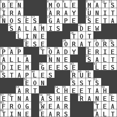 ACROSS 1. Benjamin's nick name 4. Undercover agent 8. Floor protectors 12. Lyricist Gershwin 13. Like ___ of sunshine 14. A single undivided whole 15. Olfactory organs 18. Open wide 19. Bristle 20. Deli grouping 22. Morning condensation 23. Actor's bit 24. Small child 25. Compass dir. 26. Speakers 30. Infant food 33. Sycophant 36. 4th largest of the Great Lakes 37. Silent film actress Nazimova 39. Compass dir. 40. Table seasoning 41. South Vietnam president (1954) 42. Honkers 44. French article 45. Paper fasteners 47. Regret 50. Period of immesurable duration 51. Fast planes 53. Tate display 54. Leopard's kin 57. Inactive volcano in Sicily 59. American tennis player Robert 61. Indian princess (variant) 63. Toadlike animal 64. Erode 65. Beverage made from leaves 66. Prong on a fork 67. Hearing organs 68. Keyboard modifier key DOWN 1. Storage container 2. Greek god of love 3. Relating to the nose 4. Wise men 5. Mouths or openings 6. Infant locale 7. Sight organ 8. French bagpipes 9. Afresh 10. Teat (slang) 11. R.R. building 16. Writer Wiesel 17. Without 21. Rendezvous 22. ___ good deed 24. Attempt to accomplish something 26. Lyric poems 27. Spoken 28. Cause heat under the collar 29. Arranges properly for use 30. Writing tablets 31. Came down and settled, as after flight 32. Entreaty 34. Washington bills 35. One (Scot) 38. Electrical Measurement 42. Commissioned military rank (abbr.) 43. Celtic language 46. Car dealer's back yard 48. One who makes use of a thing 49. Singer James 52. Before Barbara or Clara 53. Soon (poet.) 54. Burn to charcoal 55. Possessive pronoun 56. Person who is morally reprehensible 57. Newt 58. Three (prefix) 59. Deep reverence 60. Ocean 62. Ingest