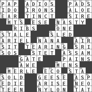 ACROSS 1. Infant food 4. Goodbye (Sp.) 9. Writing tablets 13. Wedding promise 14. Removes the wrinkles 15. _ vera 16. Hearing organ 17. A color or tint 18. Beget 19. Mountains (abbr.) 21. Compass dir. 22. Thoroughly unpleasant 24. Chest bones 26. Single 27. Having lost freshness 29. Downhill vehicle 30. Satellite of Uranus 31. Grandmother 33. Atmosphere 36. Be seated 37. Rending 40. _ Lanka 41. Distress signal 42. Proofreading order 43. Indian state 45. Yard entry 47. Aches 48. Deep reverence 49. Not women's 50. Haggard of country music 52. Environmental prefix 54. R.R. building 56. Exchanged or delivered for money 57. Honkers 59. Viper 61. Singer Brickell 62. Get up 63. Modern: prefix 64. Adolescent 65. Thermoplastic polyamide 66. Make lace DOWN 1. Sliced dessert 2. First man 3. Likenesses of persons 4. Small island 5. Frees from moisture 6. Charged particles 7. At one time in the past 8. Fast jet (abbr.) 9. Went by 10. Set down 11. Dinghy 12. Observe 20. Drop; flow; fall 22. Pitcher Ryan 23. One (Scot) 25. Waist strap 27. Backtalk 28. Musical group of three 29. In a ____ (agitated or irritated) 31. Nathan's nickname 32. "We ___ not amused" (Victoria) 33. Aide 34. SW Asia republic 35. Basketball hoops 38. First name in cosmetics 39. Stare wonderingly 44. Without 45. Place where plants grow 46. Leather borer 49. With motion or animation 50. Method 51. Writer Wiesel 52. Suggestive of the supernatural 53. To provide with a ceiling 55. At sea 56. Arrange properly for use 57. Separate the seeds from cotton 58. Car or cant ending 60. Plant holder