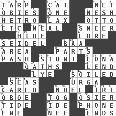 ACROSS 1. Canvas cover 5. Feline 8. Was introduced to 11. Off-Broadway awards 13. Single 14. Tender 15. Paris' subway 16. Not strict 17. "Beetle Bailey" pooch 18. And so on (abbr.) 19. Actress Patricia 21. Contemptuous expression 22. Flintstone garb 24. Old wives' tales, e.g. 25. A glass for beer 27. Sound made by sheep 29. Type of rug 30. Actors' quests 32. Romantic infatuation 33. Difficult or unusual or dangerous feat 35. Pulitzer Prize-winning author Ferber 39. Curses 41. Grant temporary use of 42. Potassium hydroxide 43. Dirtied 45. Oceans 48. Capital and largest city of Mongolia 49. Monte _, Las Vegas Hotel/Casino 50. Christmas carol 52. Three (prefix) 55. Mitch Miller's instrument 56. Coat; cloak 57. Flexible twig of a willow tree 59. Periodic rise and fall of the sea level 60. Binary compound 61. Give a jingle 62. Compass dir. 63. Born 64. Conclusions DOWN 1. Heavy book 2. Collude with 3. Actors Guy, Robert Welles, and Clint 4. For each 5. Root beer relative 6. Of or related to the anus 7. John Ritter's dad 8. Distance measurement 9. First name in cosmetics 10. Son of Odin 12. Something which is sent 14. Words to Nanette 20. Snakelike fish 21. Narrow board 23. Potato state 25. Plant excrement 26. Period 27. Prohibit 28. Nonscientific branch of learning 30. Product of festering 31. Major League Baseball Commissioner Bud 33. Filthy place 34. Definite Article 36. Accusation by an informer 37. Compass dir. 38. Increase 40. In addition 43. Take to court 44. Lowest deck of a ship 45. Unit of acoustic absorption 46. Wear away 47. Toward shelter 49. ____ d'Azur (French Riviera) 50. Thickened enlargement 51. Double curve, resembling the letter S 53. Tear apart 54. Angers 56. Metal container 58. A female animal or person