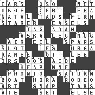 ACROSS 1. Hearing organs 5. Bear (Spanish) 8. Remaining after all deductions 11. Mitch Miller's instrument 12. Foregone conclusion 14. Epoch 15. Brizilian seaport 17. Small boys 18. Not soft or yielding to pressure 19. A viewer who gazes fixedly 21. Artist's stands 23. Label 25. First of billions? 26. "____ silly question..." 27. Part of a journey 28. Java container 31. Atmosphere 33. Snakelike fish 35. Practice fights 37. Position in a hierarchy or organization 38. French article 40. Capital and largest city of Mongolia 41. Indian princess (variant) 43. Baseball player Mel 45. Area sheltered from the wind 46. Big collection agency 47. Two (Sp.) 50. Helper 52. Pile 53. Compass dir. 54. Right away 56. Titan orbits this 61. Water vessel 62. Israeli folk dance 65. Cowboy competition 66. Tate display 67. Fastener 68. Bar bills 69. Had dinner 70. Put into a specified state 71. Otherwise DOWN 1. Immeasurably long periods of time 2. Blind as ____ 3. Roll call or roster of names 4. Shrivel 5. Sep. follower 6. Ocean 7. Severe or trying experience 8. Famous astronaut Armstrong 9. Blunders 10. Scottish cap 13. Sadhe (variant) 16. Allows 18. Opposite of masc. 20. Immoral or dissolute person 22. Settles 24. Highlander 26. Johnson of "Laugh-In" 28. Female horse 29. Goad 30. Girls' org. (abbr.) 31. Having or resembling wings 32. Charged particles 34. Lion 36. Whimper 37. _ Lanka 39. Comedian Laurel of Laurel & Hardy 42. Genesis locale 44. Airtight sealed metal containers 48. Curses 49. Soup utensils 51. Letter starter 52. Being at a high temperature 54. Left side of a ship or aircraft 55. Pace 57. Haul 58. Hereditary estate 59. Confederate soldiers (slang) 60. Characteristic smell of wine 61. Sound made by sheep 63. Actress Charlotte 64. Fitting