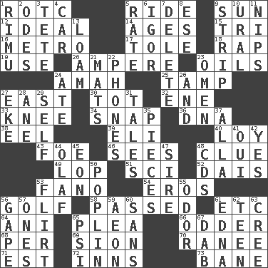 ACROSS 1. College mil. group 5. Travel on an animal 9. Player for Phoenix 12. Standard of perfection 14. Matures 15. Three (prefix) 16. Paris' subway 17. Lacquered or enameled metalware 18. Hit sharply and swiftly 19. Purpose 20. Electrical Unit 23. Lubricates 24. Nursemaid 25. Pack (down) 27. 90 degrees 30. Small child 32. Compass dir. 33. Leg joint 34. Fastener 36. Heredity factor (abbr.) 38. Snakelike fish 39. Biblical high priest 40. Myrna of the movies 43. Enemy 46. Observes 48. A slight indication 49. Trim (branches) 51. _-fi 52. Raised platform 53. Papal veil 54. Greek god of love 56. _ course 58. Went by 61. And so on (abbr.) 64. Black tropical American cuckoo 65. Entreaty 66. More peculiar 68. For each 69. The Jewish people; Israel 70. Indian princess (variant) 71. Eastern Standard Time (abbr.) 72. Taverns 73. Object of repulsion DOWN 1. Tall New Zealand timber tree 2. Lyric poems 3. Wig 4. Automobile 5. Assign a rank or rating to 6. Composer Stravinsky 7. Erase 8. Compass dir. 9. Remove all contents or possession from 10. Mountain range 11. Pinches, bites 13. Rich soil 21. Floor protectors 22. Gives a jingle 23. Sign of things to come 24. Had dinner 26. Plus 27. Supplement with great effort 28. One (Scot) 29. Itself 31. Stories 35. Parts 37. Silent film actress Nazimova 41. Fr. "Yes" 42. Consenting reply 44. Norwegian king 45. Period of immesurable duration 47. Male parent of an animal 48. Music discs 50. Cotton for raincoats, e.g. 53. Seductive woman who exploits men 55. Scent 56. Stare wonderingly 57. Singles 59. A really long time 60. Without 61. Pulitzer Prize-winning author Ferber 62. Adolescent 63. Algonquian 65. 23rd letter of the Greek alphabet 67. Small moist lump or mass