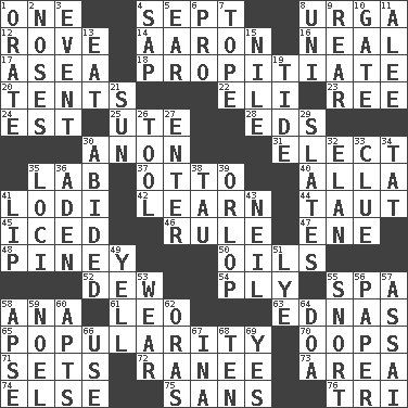 ACROSS 1. Single 4. Back-to-school mo. 8. Capital and largest city of Mongolia 12. Be footloose 14. Composer Copland 16. Be tempered by heat 17. Toward the sea 18. Appease 20. Portable shelters 22. Biblical high priest 23. Portuguese money of account (variant) 24. Eastern Standard Time (abbr.) 25. Shoshoni 28. Begley and Asner 30. Soon (poet.) 31. Opt 35. Experiment locale 37. Von Bismarck 40. Silent film actress Nazimova 41. Farming town in central California 42. Acquire or gain knowledge or skills 44. Strained 45. On the rocks 46. Governing power 47. Compass dir. 48. Abounding in pines 50. Lubricates 52. Morning condensation 54. Travel a route regularly 55. Health resort 58. Santa ___, CA 61. Lion 63. Ferber et al. 65. Teen's desire 70. I made a mistake 71. Arranges properly for use 72. The wife of a rajah (variant) 73. Type of rug 74. Otherwise 75. Without 76. Three (prefix) DOWN 1. Declaim 2. Olfactory organs 3. Happening 4. Plant excrement 5. Ewer handle 6. Adept person 7. Drink excessively 8. University (slang) 9. Bring up, as a child 10. Yard entry 11. Toward shelter 13. Erode 15. The longest river in the world 19. Event that recurs at intervals 21. Player for Phoenix 26. Implement 27. Keyboard key 29. Chalkboards 30. Remained 32. Flair 33. A slight indication 34. Make lace 35. Event scenes 36. An important port of Yemen 38. The 19th letter of the Greek alphabet 39. Fourth or lowest deck 41. Mouth edge 43. Famous astronaut Armstrong 49. Shout 51. Sodium hydroxide 53. Erode 55. Derisive sound 56. Some stationery 57. Slender Brazilian palm 58. Domed church section 59. Christmas carol 60. Tenement units (abbr.) 62. Mouths or openings 64. ___ good deed 66. Purpose 67. _ tizzy (2 wds.) 68. "___ Little Indians" 69. Consenting reply