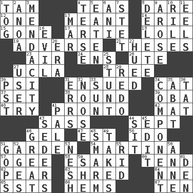ACROSS 1. Scottish cap 4. Beverages made from leaves 8. Have the gumption 12. Single 13. Intended 14. One of the Great Lakes 15. Went 17. Nick name for Arthur 18. Hang loosely or laxly 19. Contrary to your interests or welfare 21. College papers 23. Atmosphere 24. Followers of ems 26. Shoshoni 27. Southern CA. univ. 28. Family _ (genealogy) 30. Air pressure measure (abbr.) 31. Followed as a consequence or result 34. Feline 37. Arrange properly for use 38. Unit of ammunition 39. Chief or king in Benin or Nigeria 40. Attempt 41. Right away 42. Floor covering 43. Backtalk 44. Back-to-school mo. 46. Set 47. Eastern Standard Time (abbr.) 50. Wedding promise 51. Place where plants grow 54. Chrissie's court nemesis 57. Double curve, resembling the letter S 58. 1973 Nobel Price Winner (Physics) Leo 60. Watch over 62. Lightbulb-shaped fruit 63. Fragment 64. Compass dir. 65. Fast planes 66. Folds over and sews together 67. "___ Little Indians" DOWN 1. Coat; cloak 2. Small Philippine buffalo 3. Ananias' fault 4. Laconic 5. Eroded 6. Black tropical American cuckoo 7. Proofreading order 8. Keyboard key 9. Came up 10. Cause heat under the collar 11. Snakelike fish 13. Third mo. 16. Morally bad or wrong 20. Period 22. Became colored 25. Difficult or unusual or dangerous feat 27. One who uses or employs something 29. Do over again 30. Pacific Standard Time (abbr.) 31. Blunders 32. Trap for birds or small mammals 33. Player for Phoenix 34. Piece 35. Blind as ____ 36. Make lace 41. Light colored 43. Spring feasts 44. Be seated 45. Prepare for publication 46. Relatively large 48. Excessive but superficial compliments 49. Receives possession of 51. Republicans 52. Eras 53. Tender 55. To free from 56. Queen of England 1702-14 59. A female animal or person 61. Lair
