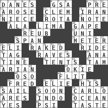 ACROSS 1. Natives or inhabitants of Denmark 6. Girls' org. (abbr.) 9. Before (prefix) 12. Came up 13. Clement's nick name 14. SW Asia republic 15. Sibling's daughter 16. Roll call or roster of names 17. Observe 18. According to 19. Pale green bean 20. Open wide 21. Reuben's nickname 23. Corn or form start 24. Connect, as a bridge 25. Distance measurement 28. Connecticut Ivy Leaguer 30. Swept the length of 34. Travel on or in a vehicle 35. Label 36. All-night dance parties 38. Santa ___, CA 39. Prong on a fork 41. Portable shelters 43. Scottish cap 44. Believer in; advocate of (suffix) 46. Migrant worker of the '30s 48. Bear (Spanish) 49. Sudden quick movement 50. Flintstone 51. Writer Wiesel 53. Part of HMS, perhaps 56. Move on water 57. Within a short period 58. Monte _, Las Vegas Hotel/Casino 60. Ancient Greek god of war 61. Southeast Asian peninsula 62. Sea 63. Affirmative reply 64. 23rd letter of the Greek alphabet 65. Clothes sense DOWN 1. One of the 12 tribes of Israel 2. Roberta Peters solo 3. Christmas carol 4. Fortification 5. Perceive with the eye 6. Seize upon or latch onto something 7. Stalk of a moss capsule 8. Housemaid (var.) 9. Conciliate 10. Assign a rank or rating to 11. Compass dir. 13. Baby bed with high sides 14. More empty; more void 19. Type of eclipse 20. Chewing product 22. Ewer handle 24. Seigniories (variant) 26. Pulitzer Prize-winning author Ferber 27. 480, 500 or 516 sheets of paper 28. Singer James 29. Den 31. Krazy ___ of comics 32. Night before a holiday 33. Lair 37. Took without asking 40. Artist's stands 42. What Jean-Claude Killy likes to do 45. Dreamland 47. New York city 49. A pale, very dry sherry 50. Conductor's collection 51. Immeasurably long periods of time 52. Farming town in central California 54. Angers 55. Narrow board 56. Declare 57. Small drink 58. Small bed 59. Single
