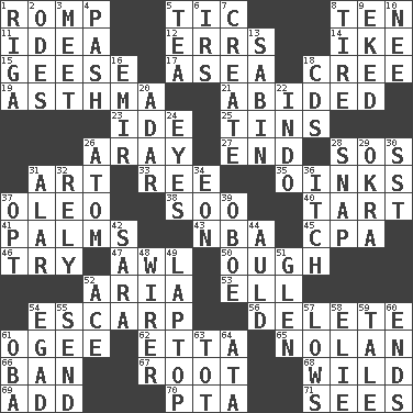 ACROSS 1. Frolic 5. Nervous spasm 8. "___ Little Indians" 11. The content of cognition 12. Blunders 14. Mamie's husband 15. Honkers 17. At sea 18. Algonquian 19. Respiratory problem 21. Stayed 23. Binary compound 25. Metal containers 26. Like ___ of sunshine 27. Conclusion 28. Mayday 31. Tate display 33. Portuguese money of account (variant) 35. Pig sounds 37. Margarine 38. "Barney Miller" actor Jack 40. Small pie 41. Insides of hands 43. Basketball assoc. 45. Accounting whiz (abbr.) 46. Attempt 47. Leather borer 50. Ending for "Through" and "Enough" 52. Operatic vocal solo 53. Pipe bend 54. Fortification 56. Keyboard key 61. Double curve, resembling the letter S 62. Singer James 65. Pitcher Ryan 66. Prohibit 67. Carrot, for example 68. Rampant 69. Find the sum of 70. Parent Teacher Association (abbr.) 71. Perceives with the eye DOWN 1. Port city in Latvia 2. Lyric poems 3. Rendezvous 4. Romantic infatuation 5. Beverage made from leaves 6. Big collection agency 7. Make 8. Hoop that covers a wheel 9. Made supply last 10. Born 13. Unit of acoustic absorption 16. Arab leader 18. Music discs 20. The sixth month of the Jewish calendar 22. _ china 24. Snake ____ (dice throw) 26. Tiny particle 28. Fastener 29. Gumbo ingredient 30. Fast jet (abbr.) 31. Having or resembling wings 32. Trust 34. Period of immesurable duration 36. Hankering 37. Elect 39. Mitch Miller's instrument 42. "Two Mules for Sister ____" 44. Old (Scot.) 48. One who wires 49. Portable computer 51. Small, secluded valley 52. Adept person 54. Mild oath 55. Post 57. Coldest temperatures 58. Writer Wiesel 59. Lie 60. Conclusions 61. Chief or king in Benin or Nigeria 63. Small child 64. "One Day ___ Time"