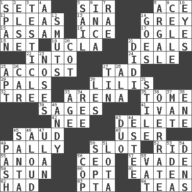 ACROSS 1. Bristle 5. Title for a knight 8. Adept person 11. Entreaties 13. Santa ___, CA 14. Jennifer or Joel 15. Indian state 16. Frozen water 17. Stare 18. Fish or hair follower 19. Southern CA. univ. 21. Allots cards 22. To the inside or interior of 24. Small island 25. Buttonhole 27. Small boy 29. Friends 30. Ms. Damita and namesakes 32. Relationship diagram 33. Sports stadium 35. Heavy book 39. Gurus 41. _ the terrible 42. Born 43. Erase 45. Saudi Arabian king (1953-1964) 48. One who uses or employs something 49. Friendly 50. Notch 52. To free from 55. Small Philippine buffalo 56. Corporate head (abbr.) 57. Elude 59. Make senseless or dizzy 60. Choose 61. Ingested 62. Possessed 63. Parent Teacher Association (abbr.) 64. Afternoon social gatherings DOWN 1. Connect, as a bridge 2. Otherwise 3. One of the two male reproductive glands 4. Auto club (abbr.) 5. Move on water 6. South American Indian 7. Actress Charlotte 8. Therefore, facetiously 9. Cell (Danish) 10. Snake ____ (dice throw) 12. Particles of soot 14. Leaves 20. Small bed 21. "You Light Up My Life" star Conn 23. Olfactory organs 25. Fitting 26. Automobile 27. Metal container 28. Chicken ___ king 30. French article 31. Vertical member of a panel or frame 33. Grow older 34. To separate or throw off 36. Make much ado about nothing 37. Floor covering 38. Compass dir. 40. Actor Griffith 43. Superhero pair 44. First name in cosmetics 45. Before Barbara or Clara 46. Verbally 47. ____ Bator 49. Romantic infatuation 50. Back-to-school mo. 51. Globular water bottle used in Asia 53. The content of cognition 54. Hiding places for outlaws 56. Police officer (slang) 58. Large container