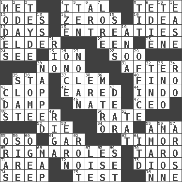 ACROSS 1. Was introduced to 4. Slanted text style (abbr.) 8. Wig 12. Lyric poems 14. Nothings 16. The content of cognition 17. 24-hour periods 18. Pleas 20. A person who is older than you are 22. Car or cant ending 23. Compass dir. 24. Observe 25. Electrically charged atom 28. "Barney Miller" actor Jack 30. Words to Nanette 31. Following 35. R.R. building 37. Clement's nick name 40. Fine (Spanish) 41. Hoof sound 42. Having ears or earlike features 44. _ china 45. Moist 46. Nathan's nickname 47. Corporate head (abbr.) 48. Bull 50. Pace 52. Expire 54. Mouth or opening 55. Nursemaid (var.) 58. Bear (Spanish) 61. Slender fish 63. The easternmost of the Lesser Sundas 65. Frustrating wastes of time 70. Edible starchy tuberous root 71. Type of rug 72. Annoying sound 73. "Vaya con ____" 74. Ooze 75. Trial 76. Compass dir. DOWN 1. Methods 2. Peak District village in England 3. Miss Universe 1986, Barbara Palacios _ 4. Ending with capital 5. Nine, plus one 6. Tate display 7. Old wives' tales, e.g. 8. Teat (slang) 9. Singer Brickell 10. Adolescent 11. Relaxation 13. Compass dir. 15. Observes 19. Small Philippine buffalo 21. _ de Janeiro 26. Single time 27. Pitcher Ryan 29. Public position 30. Slept 32. Prong on a fork 33. Inside; within (prefix) 34. Friend of Pooh 35. Narrow board 36. Heavy book 38. Period 39. Paris' subway 41. Music discs 43. Letter starter 49. Port city in Latvia 51. Make lace 53. Merit 55. At full speed 56. Person of subnormal intelligence 57. Came up 58. Mouths or openings 59. The founder of a family 60. Double curve, resembling the letter S 62. Carrot, for example 64. It would 66. Atlas unit 67. Untruth 68. Curvy letter 69. Arrange properly for use