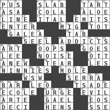 ACROSS 1. Fluid product of inflammation 4. Thick slice 8. Small pie 12. White ___ sheet 13. Root beer relative 14. _ vera 15. Actor's bit 17. Slanted text style (abbr.) 18. Gives off 19. Keyboard key 21. Russian fighter aircraft 23. Small child 24. An organ shaped like a helmet 26. Keyboard key 28. Sew up the eyelids of hawks and falcons 30. Inveterate users 34. Nonscientific branch of learning 37. I made a mistake 39. Travels 40. Area sheltered from the wind 41. Annoying sound 43. Baseball player Mel 44. Afresh 46. Separate forcefully 47. French article 48. Simpletons 51. Undercover agent 54. Compass dir. 55. Father Junipero _ 58. Oblong piece of solid material 61. Lion 63. Sadhe (variant) 65. Learning spot: Fr. 67. Goad 71. Morally bad or wrong 72. Johnson of "Laugh-In" 73. Highlander 74. Greek goddess of the dawn 75. Tenth: prefix 76. Coop moms 77. Compass dir. DOWN 1. Diluted with white 2. Exploiting 3. Before Barbara or Clara 4. _-fi 5. Car dealer's back yard 6. Wing 7. Lip ointment 8. Scottish cap 9. Came down and settled, as after flight 10. Printing process, for short 11. Trial 16. Snakelike fish 18. Mild oath 20. To riddle 22. It would 25. Period of immesurable duration 27. Of large size 29. Plunders 30. Indian state 31. Calm and collected 32. False hair 33. Fast planes 34. Actor Alda or Thicke 35. Painter Guido (1575-1642) 36. Adolescent 38. Sliced dessert 42. Greek god of love 45. Compass dir. 49. Capri or Wight 50. She-sheep 52. Allow 53. Celtic language 56. All-night dance parties 57. Goodbye (Sp.) 58. Necklace unit 59. 1/640 square mile 60. College mil. group 62. Ending for "Through" and "Enough" 64. Otherwise 66. Luau accessory 68. Actress Charlotte 69. Commissioned military rank (abbr.) 70. Raised railways