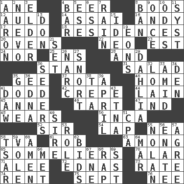 ACROSS 1. A saturated hydrocarbon 4. Fermented drink made from hops 8. Expressions of contempt or scorn 12. Old (Scot.) 14. Slender Brazilian palm 16. Actor Griffith 17. Do over again 18. Homes 20. Baking chambers 22. Modern: prefix 23. Eastern Standard Time (abbr.) 24. And not 25. Followers of ems 28. Plus 30. Comedian Laurel of Laurel & Hardy 31. First course 35. Unit of force equal to gravity 37. Round or rotation of duties 40. Residence 41. Texas town _ City 42. Streamer paper 44. (Had) reclined 45. Singer Murray 46. Small pie 47. Working for oneself (abbr.) 48. Erodes 50. South American Indian 52. Title for a knight 54. Infant locale 55. Teachers' org. 58. Federal power corp. 61. Director Reiner 63. Amid 65. Wine waiters 70. Having or resembling wings 71. Toward shelter 72. Ferber et al. 73. Pace 74. Monthly bill 75. Back-to-school mo. 76. Born DOWN 1. Composer Copland 2. New (sp.) 3. A person who is older than you are 4. Oblong piece of solid material 5. Compass dir. 6. Double-curved letter 7. Precipitation 8. Forbid 9. At one time in the past 10. Lyric poems 11. System (abbr.) 13. Spanish title 15. The content of cognition 19. Immeasurably long periods of time 21. Put into a specified state 26. Drug cop 27. Derisive sound 29. A pale violet or amethyst color 30. Spring feasts 32. Grant temporary use of 33. Among 34. Lair 35. Went 36. Pulitzer Prize-winning author Ferber 38. Beverage made from leaves 39. Showery time 41. Simpleton 43. Inactive volcano in Sicily 49. The founder of a family 51. Tax preparer (abbr.) 53. Hero or heavy, e.g. 55. Pitcher Ryan 56. Maternal 57. Match 58. Russian ruler of old 59. Short-tailed, large-bodied rat 60. So be it 62. Auction offers 64. Make imperfect 66. Was introduced to 67. Compass dir. 68. Strike 69. Fast jet (abbr.)