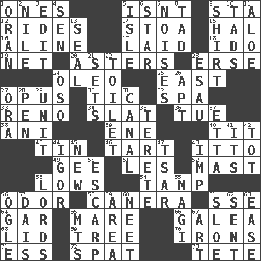 ACROSS 1. Singles 5. Is not 9. R.R. building 12. Amusement-park features 14. Portico 15. Actor Linden 16. Place in a line 17. Put down 18. Wedding promise 19. Remaining after all deductions 20. Michaelmas daisies 23. Celtic language 24. Butter sub 25. Compass direction 27. Musical composition 30. Nervous spasm 32. Health resort 33. Western Nevada city 34. Narrow board 36. Third day of the wk. 38. Black tropical American cuckoo 39. Compass dir. 40. Teat (slang) 43. Metal container 46. Small pie 48. "Tell ____ the Marines!" 49. Turn to the right 51. French article 52. Vertical spar for supporting sails 53. Coldest temperatures 54. Pack (down) 56. Scent 58. Device for capturing images 61. Compass dir. 64. Slender fish 65. Female horse 66. An organ shaped like a helmet 68. Flaplike covering 69. Woody plant 70. Metal shackles 71. Double-curved letter 72. Petty quarrel 73. Wig DOWN 1. NW Algerian seaport 2. The longest river in the world 3. Prepare for publication 4. Elected rep. 5. Capri or Wight 6. Play the lead 7. Annoying sounds 8. Small boy 9. Upper-body garment 10. Bits 11. Medicinal plant 13. Lick closed 21. Puts into a specified state 22. Bathroom 23. He sold his birthright 24. Bear (Spanish) 26. Fitting 27. Mouth or opening 28. Fenced enclosure 29. A single undivided whole 31. Lessep's creation 35. Cylindrical with tapered ends 37. Singer James 41. It is 42. Small child 44. Composer Stravinsky 45. ___ Haven, CT 47. Russian ruler of old 48. Naughty child 50. Fortification 53. Nobles 55. Wise men 56. Stare 57. Raised platform 59. Type of rug 60. Confront 61. A type of plum 62. Transmitted 63. Comfort 65. Mountains (abbr.) 67. Nonscientific branch of learning