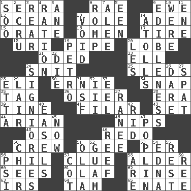 ACROSS 1. Spanish missionary in California 6. Actress Charlotte 9. She-sheep 12. Sea 13. Short-tailed, large-bodied rat 14. An important port of Yemen 15. Declaim 16. Sign of something about to happen 17. Hoop that covers a wheel 18. RI univ. 19. Corncob 20. Ear part 21. Wrote a lyric poem 23. Pipe bend 24. In a ____ (agitated or irritated) 25. Bobsleighs 28. Connecticut Ivy Leaguer 30. Bert's buddy 34. Fastener 35. Label 36. Flexible twig of a willow tree 38. Epoch 39. Prong on a fork 41. Having threads 43. Put into a specified state 44. Believer in; advocate of (suffix) 46. Pinches, bites 48. Bear (Spanish) 49. Make new 50. Ship's personnel 51. Double curve, resembling the letter S 53. For each 56. Silvers or Donahue 57. A slight indication 58. Tree or shrub in the Birch family 60. Perceives with the eye 61. Norwegian king 62. Wash lightly 63. Big collection agency 64. Scottish cap 65. Maternal DOWN 1. "Barney Miller" actor Jack 2. Shade of tan 3. Bring up, as a child 4. Food allowance for one day 5. One (Scot) 6. Frolic 7. Toward shelter 8. Car or cant ending 9. The property of being fit to eat 10. Past tense of be (plural) 11. Compass dir. 13. Nothingness 14. Ringlike coral islands and reefs 19. Stone: prefix 20. French article 22. Expire 24. Seigniories (variant) 26. Have the gumption 27. Petty quarrel 28. Singer James 29. Den 31. Science/research agcy. 32. One more than two 33. Snakelike fish 37. The wife of a rajah (variant) 40. Artist's stands 42. To free from 45. At this time 47. Cotton for raincoats, e.g. 49. Coral collection 50. "Mermaids" star 51. Spanish pot 52. Island territory of the United States 54. Pulitzer Prize-winning author Ferber 55. Respite 56. Air pressure measure (abbr.) 57. Small bed 58. "We ___ not amused" (Victoria) 59. To sift