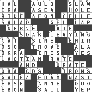 ACROSS 1. Actor Linden 4. Old (Scot.) 8. Cole _ (cabbage dish) 12. Epoch 13. Toward the sea 14. Hollow 15. Travel on an animal 17. Period of immesurable duration 18. Cell (Danish) 19. Vegetable dish 21. Set 23. Infant locale 24. Impudent aggressiveness 26. Compete 28. Neighbor of Neb. 30. Imposing or collecting, as a tax 34. Domesticated feline 37. Trig term 39. Independent ruler or chieftain 40. Bear (Spanish) 41. Collection of objects 43. Insect wing 44. Gumbo ingredient 46. Angers 47. Affirmative reply 48. Of or relating to Laos or its people 51. Assign a rank or rating to 54. Plus 55. A salt of uric acid 58. Chief or king in Benin or Nigeria 61. Music discs 63. Metal shackles 65. An organ shaped like a helmet 67. Dutch treat 71. Political cartoonist Thomas 72. Celtic language 73. Singer Murray 74. Superhero pair 75. Inky black, to poets 76. Travel by water 77. Slangy assent DOWN 1. Possessive pronoun 2. Believer in; advocate of (suffix) 3. Dipping utensil 4. Auto club (abbr.) 5. Purpose 6. Lion 7. Mild oath, euphamism for damn 8. A female animal or person 9. Hang loosely or laxly 10. Silent film actress Nazimova 11. Shed a tear 16. Hearing organs 18. 154 in Roman numerals 20. Movie disc 22. Night before a holiday 25. Compass direction 27. Sight organ 29. Japanese brewing company 30. Crowbar 31. "If ____ say so..." 32. Mediterranean tributary 33. Pate de foie ____ 34. Calm and collected 35. "____ silly question..." 36. "Corrida" creature 38. And not 42. Son of Isaac 45. _ moment's notice (2 wds.) 49. South American Indian 50. Increase 52. Three (prefix) 53. Merit 56. Sycophant 57. Follow as a consequence or result 58. Double curve, resembling the letter S 59. Sharp remark 60. In addition 62. Oceans 64. Discontinue 66. Car or cant ending 68. Heredity factor (abbr.) 69. Cuckoo 70. Cartoonist voice _ Blanc