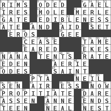 ACROSS 1. Basketball hoops 5. Wrote a lyric poem 9. Highlander 13. Angers 14. Undercover agent 15. Haggard of country music 16. Yard entry 17. The property of being fit to eat 19. Had dinner 20. Plus 21. Assist 22. Put into a specified state 23. Greek god of love 25. Turn to the right 26. Desist 30. Docile 34. Having ears or earlike features 35. Supplements with great effort 36. Nanny 39. Portable shelters 42. Pace 43. Paradise 44. Nest on high 46. Lyric poems 47. Virtuous person 48. Parent Teacher Association (abbr.) 51. Famous astronaut Armstrong 54. Elected rep. 57. Atmosphere 58. Curvy letter 60. At this time 62. Conciliate 65. Have the gumption 66. NE Netherlands city 67. Queen of England 1702-14 68. Conclusions 69. Adolescent 70. Anneal 71. A home for chicks DOWN 1. Capital of Latvia 2. Feeling or showing extreme anger 3. Distance measurement 4. Compass dir. 5. Presage 6. Texas town _ City 7. Connecticut Ivy Leaguer 8. Debunk (Brit. slang) 9. Commissioned military rank (abbr.) 10. Ancient Greek god of war 11. Otherwise 12. For fear that 15. Ancient Persian 18. Whopper 20. Toward the sea 24. Seas 27. Nonscientific branch of learning 28. Perceive with the eye 29. Ferber et al. 30. Cigar-shaped 31. Alias (abbr.) 32. Was introduced to 33. Compass dir. 36. Modern: prefix 37. Find the sum of 38. Born 40. Beverage made from leaves 41. Indian title of respect (Mr.) 45. Taverns 48. Ache 49. Teat (slang) 50. Believer in; advocate of (suffix) 52. Empty; void 53. Domineers 54. Petty quarrel 55. Celtic language 56. Olfactory organ 58. Inactive volcano in Sicily 59. Sew up the eyelids of hawks and falcons 61. Compass direction 63. Animal enclosure 64. A saturated hydrocarbon 65. Lair