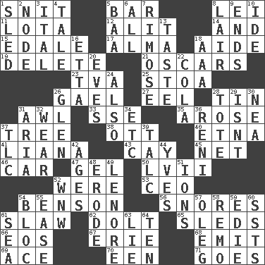 ACROSS 1. In a ____ (agitated or irritated) 5. Drinking establishment 8. Flowery wreath 11. Globular water bottle used in Asia 12. Set down 14. Also 15. Peak District village in England 17. _ mater 18. Assistant 19. Keyboard key 21. Motion picture awards 23. Federal power corp. 25. Portico 26. Highlander 27. Snakelike fish 28. Shallow baking pan 31. Leather borer 33. Compass dir. 35. Came up 37. Woody plant 38. Baseball player Mel 40. Inactive volcano in Sicily 41. Climbing, woody, usually tropical vines 43. Island 45. Fish or hair follower 46. Automobile 47. Set 50. 57 in ancient Rome 52. We are 53. Corporate head (abbr.) 54. Gillaume's butler role 56. Sounds asleep 61. Cole _ (cabbage dish) 62. Dunce 65. Bobsleighs 66. Greek goddess of the dawn 67. One of the Great Lakes 68. Send forth 69. Adept person 70. Car or cant ending 71. Moves DOWN 1. Downhill vehicle 2. Connecting point 3. Slanted text style (abbr.) 4. Falsehood 5. Sound made by sheep 6. 100% 7. Full of chinks, cracks, or crevices 8. Den 9. Conclusions 10. Binary compound 13. Clothes sense 16. Singer James 18. Auto club (abbr.) 20. Nights before holidays 22. Root beer relative 24. In addition 26. Small, secluded valley 28. Carryall 29. Is not 30. Teachers' org. 31. Operatic vocal solo 32. Erode 34. And so on (abbr.) 36. Painter Guido (1575-1642) 37. Affectionate concern, for short 39. Baby powder 42. Eons 44. Jacques Cousteau's middle name 48. Eat (away) 49. Poe poem 51. Charged particles 52. Compass dir. 54. Alliance 55. Relaxation 57. Cassini of fashion 58. San ____ (Riviera town) 59. Singer Brickell 60. Fast planes 61. Ocean 63. Untruth 64. Nine, plus one