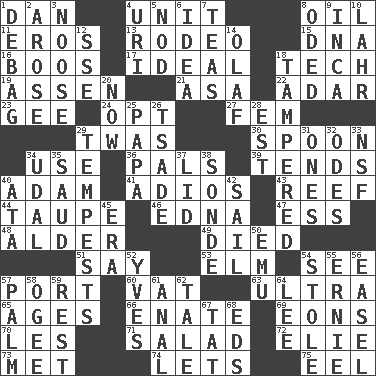 ACROSS 1. One of the 12 tribes of Israel 4. A single undivided whole 8. Lubricate 11. Greek god of love 13. Cowboy competition 15. Heredity factor (abbr.) 16. Expressions of contempt or scorn 17. Perfect 18. Technician 19. NE Netherlands city 21. White ___ sheet 22. The sixth month of the Jewish calendar 23. Unit of force equal to gravity 24. Choose 27. Opposite of masc. 29. It was, poetically 30. Soup utensil 34. Purpose 36. Friends 39. Looks after 40. First of billions? 41. Goodbye (Sp.) 43. Coral ridge 44. Grayish beige 46. Pulitzer Prize-winning author Ferber 47. Double-curved letter 48. Tree or shrub in the Birch family 49. Passed on 51. Declare 53. Shade tree 54. Perceive with the eye 57. Sweet dark-red dessert wine 60. Large container 63. Extremist 65. Matures 66. Related on the mother's side 69. Immeasurably long periods of time 70. French article 71. Vegetable dish 72. Writer Wiesel 73. Was introduced to 74. Allows 75. Snakelike fish DOWN 1. Debunk (Brit. slang) 2. Came up 3. Trap for birds or small mammals 4. RI univ. 5. Allow head to fall sleepily 6. The content of cognition 7. Afternoon social gatherings 8. Wrote a lyric poem 9. South American Indian 10. Cowardly lion portrayer 12. Compass dir. 14. Norwegian king 18. ________ with (broke a safety seal) 20. At this time 25. Dad 26. Sadhe (variant) 28. Eastern Standard Time (abbr.) 29. Storms 31. Washington bills 32. Lyric poems 33. Overdraft (abbr.) 34. Hereditary estate 35. Saudi Arabian king (1953-1964) 37. Hat (slang) 38. Something which is sent 40. "One Day ___ Time" 42. Travel by water 45. Period 50. Australian flightless bird 52. Jacques Cousteau's middle name 54. Took without asking 55. Bert's buddy 56. Artist's stand 57. Inside of hand 58. Double curve, resembling the letter S 59. Repose 61. Of or related to the anus 62. Lie 64. Area sheltered from the wind 67. Make lace 68. Begley and Asner