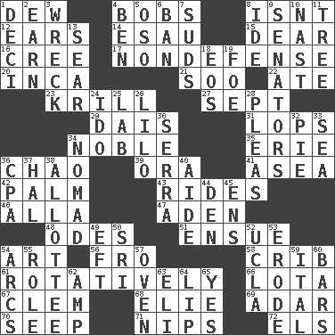 ACROSS 1. Morning condensation 4. Moves up and down 8. Is not 12. Hearing organs 14. Son of Isaac 15. Letter starter 16. Algonquian 17. Unrelated to defense, as in spending 20. South American Indian 21. "Barney Miller" actor Jack 22. Had dinner 23. The principal food of baleen whales 27. Back-to-school mo. 29. Raised platform 31. Chops off 34. Impressive in appearance 35. 4th largest of the Great Lakes 36. US Secretary of Labor Elaine L. _ 39. Mouth or opening 41. Toward the sea 42. Inside of hand 43. Amusement-park features 46. Silent film actress Nazimova 47. Arabian gulf 48. Lyric poems 51. Follow as a consequence or result 54. Tate display 56. Away 58. Baby bed with high sides 61. Happening in regular succession 66. Globular water bottle used in Asia 67. Clement's nick name 68. Writer Wiesel 69. The sixth month of the Jewish calendar 70. Ooze 71. Pinches, bites 72. Raised railways DOWN 1. Tenth: prefix 2. Merit 3. Raze 4. Benjamin's nick name 5. Bear (Spanish) 6. Prohibit 7. Beer foam 8. Binary compound 9. Elected representatives 10. Political cartoonist Thomas 11. Family _ (genealogy) 13. Shrivel 18. Greek goddess of the dawn 19. Enemy 24. Wedding promise 25. Experiment locale 26. _ and Stitch 28. Entreaties 30. Father Junipero _ 32. Sliced dessert 33. Ocean 34. Wanderer 36. Tax preparer (abbr.) 37. Actor Linden 38. One to whom something is allotted 40. Assistant 44. Lair 45. Followers of ems 49. Bank Draft (abbr.) 50. Indian title of respect (Mr.) 52. Southern CA. univ. 53. Eat (away) 54. Arches 55. Hero or heavy, e.g. 57. Baking chamber 59. Slanted text style (abbr.) 60. Oblong pieces of solid material 62. Electrical Unit 63. Biblical high priest 64. Mouth edge 65. Affirmative reply