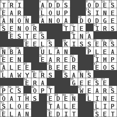 ACROSS 1. Three (prefix) 4. Does sums 8. Lyric poems 12. Hearing organ 13. Central Nebraska county 14. Trig term 15. At once, immediately (arch.) 17. Small Philippine buffalo 18. Evade 19. Sir (Sp.) 21. Neckwear 23. Big collection agency 24. _____ Park, CO 26. _ tizzy (2 wds.) 28. Snakelike fish 30. Smoochers 34. Basketball assoc. 37. ____ Bator 39. Entreaty 40. Car or cant ending 41. Having ears or earlike features 43. Naughty child 44. Toward shelter 46. Fermented drink made from hops 47. Greek goddess of the dawn 48. Those who practice law 51. Without 54. Period 55. Honkers 58. Personal Computers (abbr.) 61. Choose 63. Erodes 65. Profane or obscene expressions 67. Genesis locale 71. Actor's bit 72. _ gin 73. Story 74. Mouth edge 75. Flair 76. Prepare for publication 77. Arrange properly for use DOWN 1. Afternoon social gatherings 2. The wife of a rajah (variant) 3. Metal shackles 4. In the manner of 5. Spanish title 6. Superhero pair 7. Argument over a trivial matter 8. Bear (Spanish) 9. "You Light Up My Life" star Conn 10. Engineer (abbr.) 11. Perceives with the eye 16. Short letter 18. Habitations of wild animals 20. To sift 22. One more than two 25. Turn sharply 27. Viper 29. Broad, flat, thick pieces 30. Leg joints 31. Writer Wiesel 32. San ____ (Riviera town) 33. Plant excrements 34. Be tempered by heat 35. Actor Lugosi 36. Afresh 38. "We ___ not amused" (Victoria) 42. To be drawn or hauled along 45. Sight organ 49. Greek god of love 50. Strike 52. ___ Haven, CT 53. Stitch closed the eyes of (a falcon) 56. Moves on water 57. Bert's buddy 58. Airs 59. Give a ring to 60. Portico 62. Wig 64. Back-to-school mo. 66. Layer 68. Male parent 69. Connecticut Ivy Leaguer 70. Remaining after all deductions
