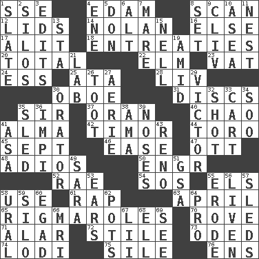 ACROSS 1. Compass dir. 4. Dutch treat 8. Skim 12. Hats (slang) 14. Pitcher Ryan 16. Otherwise 17. Set down 18. Pleas 20. "_____ Recall" 22. Shade tree 23. Large container 24. Curvy letter 25. _ moment's notice (2 wds.) 28. 54 in ancient Rome 30. Mitch Miller's instrument 31. Plates 35. Title for a knight 37. Northwest Algerian city 40. US Secretary of Labor Elaine L. _ 41. _ mater 42. Southeast Indonesia island 44. "Corrida" creature 45. Back-to-school mo. 46. Relaxation 47. Baseball player Mel 48. Goodbye (Sp.) 50. Engineer (abbr.) 52. Actress Charlotte 54. Distress signal 55. Raised railways 58. Purpose 61. Reproach for some lapse or misdeed 63. Showery time 65. Frustrating wastes of time 70. Be footloose 71. Having or resembling wings 72. Vertical member of a panel or frame 73. Wrote a lyric poem 74. Farming town in central California 75. Drop; flow; fall 76. Followers of ems DOWN 1. Schedule 2. Grain storage towers 3. Proofreads 4. Compass dir. 5. Spanish title 6. Keyboard modifier key 7. Female horse 8. Put into a specified state 9. 154 in Roman numerals 10. Toward the sea 11. A home for chicks 13. R.R. building 15. 1994 drama film starring Jodie Foster 19. Among 21. Experiment locale 26. A blast of a horn 27. Nest on high 29. Winning man's name 30. Speaker 32. Attempt 33. Haul 34. "Barney Miller" actor Jack 35. Downhill vehicle 36. Body of Kaffir warriors 38. Housemaid (var.) 39. Olfactory organs 41. White ___ sheet 43. Western Nevada city 49. "Two Mules for Sister ____" 51. Girls' org. (abbr.) 53. Hearing organs 55. Wear away 56. Make or become more lively 57. Bobsleighs 58. Mountain range 59. Grain storage tower 60. Mild oath 62. Cooking vessels 64. Adept person 66. Medical imaging device (abbr.) 67. Cards in a Roman deck? 68. Pipe bend 69. Observe