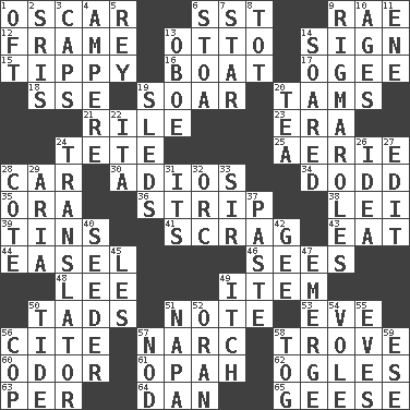 ACROSS 1. Motion picture award 6. Fast jet (abbr.) 9. Actress Charlotte 12. Movie unit 13. "Beetle Bailey" pooch 14. Signal 15. Likely to tip or tilt 16. Water vessel 17. Double curve, resembling the letter S 18. Compass dir. 19. Fly high 20. Scottish caps 21. Cause heat under the collar 23. Period 24. False hair 25. Nest on high 28. Auto 30. Goodbye (Sp.) 34. Texas town _ City 35. Mouth or opening 36. Empty completely 38. Luau accessory 39. Canisters 41. Strangle with an iron collar 43. Erode 44. Artist's stand 46. Perceives with the eye 48. Area sheltered from the wind 49. A distinct part 50. Bits 51. Observe 53. First lady 56. Quote 57. Drug cop 58. Collection of objects 60. Aroma 61. Brightly colored fish 62. Stares at amorously 63. For each 64. Daniel's nick name 65. Honkers DOWN 1. Often (poetically) 2. Indian titles of respect 3. Smile enhancers 4. Electrical Unit 5. Marina Del _, California 6. Portico 7. Play the lead 8. Small child 9. Complicated, petty procedures 10. Grows older 11. Compass dir. 13. Mitch Miller's instrument 14. Flew 19. Bobsleighs 20. Beverage made from leaves 22. Call ___ day 24. Interpreter 26. The main thing one is thinking about 27. Prepare for publication 28. ____ d'Azur (French Riviera) 29. Operatic vocal solo 31. It is 32. The grampus (Milton) 33. Title for a knight 37. Thick mixture 40. Sowing specialist 42. Turn to the right 45. French article 47. Develop 49. Hankering 50. Event that recurs at intervals 51. California wine valley 52. NW Algerian seaport 54. Grand slam 55. Nights before holidays 56. Police officer (slang) 57. Dreamland 58. Coat; cloak 59. Compass dir.