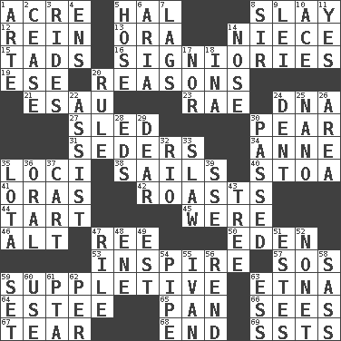 ACROSS 1. Land measure 5. Actor Linden 8. Kill 12. It's straight from the horse's mouth 13. Mouth or opening 14. Sibling's daughter 15. Bits 16. Seigniories (variant) 19. Compass dir. 20. Thinks logically 21. He sold his birthright 23. Actress Charlotte 24. Heredity factor (abbr.) 27. Downhill vehicle 30. Lightbulb-shaped fruit 31. Spring feasts 34. Queen of England 1702-14 35. Event scenes 38. Moves on water 40. Portico 41. Mouths or openings 42. Cooks with dry heat, as in an oven 44. Small pie 45. We are 46. Keyboard modifier key 47. To sift 50. Locale of original sin 53. Stimulate to action 57. Distress signal 59. Supplying deficiencies 63. Inactive volcano in Sicily 64. First name in cosmetics 65. Baking dish 66. Perceives with the eye 67. Pull into pieces 68. Conclude 69. Fast planes DOWN 1. Johnson of "Laugh-In" 2. Desist 3. Amusement-park features 4. Followers of ems 5. Flexible conduit 6. Roberta Peters solo 7. Falls behind 8. Title for a knight 9. Luau accessory 10. Adept person 11. Consenting reply 14. Characteristic smell of wine 17. And not 18. _ tizzy (2 wds.) 20. Governing power 22. Help 24. Undesirable depression on a surface 25. Billionth: prefix 26. Type of rug 28. Begley and Asner 29. Letter starter 30. Went by 32. _ de Janeiro 33. Cole _ (cabbage dish) 35. Globular water bottle used in Asia 36. Of the mouth 37. Heavy open wagon 39. Compass dir. 43. Woody plant 47. Cause heat under the collar 48. Compass dir. 49. Eastern Standard Time (abbr.) 51. _____ Park, CO 52. Music written for nine 54. Corncob 55. "Terrible" tsar 56. Tear apart 58. Backtalk 59. Put into a specified state 60. Purpose 61. Parent Teacher Association (abbr.) 62. For each 63. Curvy letter