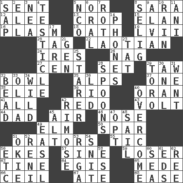 ACROSS 1. Emitted 5. And not 8. "Two Mules for Sister ____" 12. Toward shelter 13. Riding implement 15. Liveliness 16. Suffix with ecto or cyto 18. Pledge 19. 57 in ancient Rome 20. Label 22. Of or relating to Laos or its people 24. Angers 26. Tired old horse 27. Penny 28. Put into a specified state 29. The 23rd letter of the Hebrew alphabet 32. Soup holder 35. High mountains 37. Single 38. Writer Wiesel 39. River (Sp.) 40. Northwest Algerian city 41. Everything 42. Do over again 43. Electrical Unit 44. Male parent 45. Atmosphere 46. Olfactory organ 49. Shade tree 50. Coast Guard woman 51. Speakers 55. Nervous spasm 56. Makes supply last 57. Trig term 59. Failure 63. Prong on a fork 64. Armor plate that protects the chest 65. Ancient Persian 66. To provide with a ceiling 67. Had dinner 68. Relaxation DOWN 1. Plant excrement 2. Pipe bend 3. Teachers' org. 4. One of the two male reproductive glands 5. Non-commissioned officer (abbr.) 6. Of the mouth 7. Roll call or roster of names 8. Former Milwaukee Brewers owner Bud 9. Inventor's middle name 10. Water falling in drops from the sky 11. Cuckoo 14. Gives a jingle 17. Female horse 21. Commissioned military rank (abbr.) 23. Make lace 25. A viewer who gazes fixedly 28. Soup utensils 29. "Corrida" creature 30. Of or related to the anus 31. Gone 32. Necklace unit 33. Rounded earthenware pot or jar 34. Rampant 36. Flaplike covering 40. Conquer 42. Full of chinks, cracks, or crevices 45. Keyboard modifier key 47. Choose 48. Travel by water 49. Artist's stand 51. Migrant worker of the '30s 52. Painter Guido (1575-1642) 53. Capital of Latvia 54. In a ____ (agitated or irritated) 56. And so on (abbr.) 58. Compass dir. 60. Ocean 61. Begley and Asner 62. Portuguese money of account (variant)