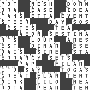 ACROSS 1. Cooking vessel 4. Soft 8. Dormintory (informal) 12. Mouth or opening 13. Relaxation 14. The content of cognition 15. Scottish caps 17. Singer James 18. Happening 19. Bull 21. 24 hours 23. Mayday 24. _____ Park, CO 26. Beverage made from leaves 28. Period of immesurable duration 30. French poetic form 34. Mountains (abbr.) 37. Central Nebraska county 39. Ancient Greek god of war 40. Eastern Standard Time (abbr.) 41. Middle Eastern gold or silver currency 43. Compass dir. 44. Raised platform 46. Beget 47. R.R. building 48. Tendancy to err 51. Arranges properly for use 54. Infant food 55. Of or pertaining to a thread or threads 58. It would 61. Declare 63. Ancient Roman robes 65. Relatively large 67. Style 71. Portable shelter 72. Pig sound 73. _ and Stitch 74. Teachers' org. 75. Roll call or roster of names 76. Lightbulb-shaped fruit 77. Nine, plus one DOWN 1. Plant holders 2. Declaim 3. Domesticates 4. Born 5. Ingest 6. Fast jet (abbr.) 7. Froth on beer 8. HTML Container Element 9. Lyric poems 10. Western Nevada city 11. Floor protectors 16. Stalk of a moss capsule 18. Sight organs 20. To riddle 22. Had dinner 25. Disposed of to a purchaser 27. "One Day ___ Time" 29. Annoyingly loud 30. Practice fights 31. Angers 32. Egg locale 33. At sea 34. Ancient Persian 35. Russian ruler of old 36. Agitate 38. University (slang) 42. Coral ridge 45. Plant excrement 49. Political cartoonist Thomas 50. Accounting whiz (abbr.) 52. Teat (slang) 53. Narrow opening 56. Rep 57. The wife of a rajah (variant) 58. Composer Stravinsky 59. Musical group of three 60. Undesirable depression on a surface 62. Sharp bark 64. Comedian Laurel of Laurel & Hardy 66. Alias (abbr.) 68. Falsehood 69. Insect wing 70. And not
