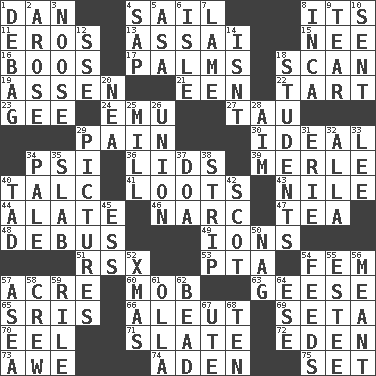 ACROSS 1. One of the 12 tribes of Israel 4. Travel by water 8. It is 11. Greek god of love 13. Slender Brazilian palm 15. Born 16. Scornful sounds 17. Insides of hands 18. Examine hastily 19. NE Netherlands city 21. Car or cant ending 22. Small pie 23. Unit of force equal to gravity 24. Australian flightless bird 27. The 19th letter of the Greek alphabet 29. Ache 30. Perfect 34. Air pressure measure (abbr.) 36. Flaplike coverings 39. Haggard of country music 40. Baby powder 41. Plunders 43. The longest river in the world 44. Having winglike extensions 46. Drug cop 47. Beverage made from leaves 48. To get out of a bus 49. Charged particles 51. Acura sports coupe 53. Parent Teacher Association (abbr.) 54. Opposite of masc. 57. 43,560 square feet 60. Crowd into 63. Honkers 65. Indian titles of respect 66. Eskimo relative 69. Stalk of a moss capsule 70. Snakelike fish 71. Chalkboard 72. Locale of original sin 73. Deep reverence 74. Arabian gulf 75. Put into a specified state DOWN 1. Debunk (Brit. slang) 2. Came up 3. Trap for birds or small mammals 4. Plant excrement 5. White ___ sheet 6. Capri or Wight 7. Unable to walk 8. South American Indian 9. Separate forcefully 10. Posted 12. Compass dir. 14. Is not 18. SAT takers 20. Teachers' org. 25. Place where flour is made 26. The state of being joined or united 28. Direct toward a target or goal 29. Photos 31. 4th largest of the Great Lakes 32. Silent film actress Nazimova 33. Area sheltered from the wind 34. Light colored 35. Thick slice 37. ___ good deed 38. Empty completely 40. Small boy 42. Highlander 45. Curvy letter 50. Tired old horse 52. Dec. holiday 54. Gives food to 55. First name in cosmetics 56. Intended 57. Toward the sea 58. Group working together 59. Cause heat under the collar 61. Rounded earthenware pot or jar 62. Necklace unit 64. Compass dir. 67. Shoshoni 68. Nine, plus one