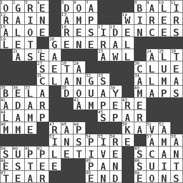 ACROSS 1. Legendary monster 5. ___ good deed 8. Indonesian resort city 12. Water falling in drops from the sky 13. Electrical Unit 14. One who wires 15. _ vera 16. Dwellings 19. Allow 20. Commissioned military rank 21. At sea 23. Leather borer 24. Keyboard modifier key 27. Stalk of a moss capsule 30. A slight indication 31. Rings loudly 34. _ mater 35. Actor Lugosi 38. A city in N France, SE of Calais 40. Atlas contents 41. The sixth month of the Jewish calendar 42. Electrical Unit 44. Desk light 45. Practice fight 46. Madame (abbr.) 47. Strike 50. Polynesian shrub of the pepper family 53. Stimulate to action 57. Nanny (var.) 59. Supplying deficiencies 63. Examine hastily 64. First name in cosmetics 65. Baking dish 66. Set of matching outer garments 67. Separate forcefully 68. Conclude 69. Immeasurably long periods of time DOWN 1. Relating to the mouth 2. An organ shaped like a helmet 3. Debaucheries 4. Compass dir. 5. Have the gumption 6. Presage 7. Domed church section 8. Storage container 9. Curve 10. Area sheltered from the wind 11. Big collection agency 14. Not ill 17. Lyricist Gershwin 18. Fool 20. Highlander 22. Fortification 24. Silent film actress Nazimova 25. Mass 26. Afternoon social gatherings 28. Small amount or degree 29. Small Philippine buffalo 30. Device for capturing images 32. Chewing product 33. Plant excrements 35. Lip ointment 36. Dutch treat 37. Unable to walk 39. Slangy assent 43. Libertine 47. Cause heat under the collar 48. A saturated hydrocarbon 49. Pacific Standard Time (abbr.) 51. In a vacuum (with "in") 52. At full speed 54. Corncob 55. "Terrible" tsar 56. Tear apart 58. Pismires 59. Arrange properly for use 60. Purpose 61. Parent Teacher Assoc. 62. For each 63. Compass dir.