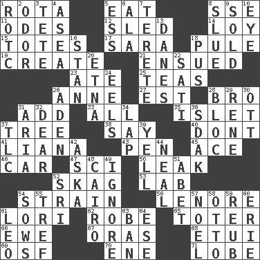ACROSS 1. Roll call or roster of names 5. Ingest 8. Compass dir. 11. Lyric poems 12. Downhill vehicle 14. Myrna of the movies 15. Hauls 17. "Two Mules for Sister ____" 18. Whine 19. Cause to be 21. Followed as a consequence or result 23. Had dinner 25. Afternoon social gatherings 26. Singer Murray 27. Eastern Standard Time (abbr.) 28. Sis' sibling 31. Increase 33. 100% 35. Small island 37. Woody plant 38. Declare 40. Do not 41. Woody, climbing, usually tropical plant 43. Writing instrument 45. Adept person 46. 4-wheeled motor vehicle 47. _-fi 50. Path through which fluid escapes 52. Heroin 53. Experiment locale 54. Put through a sieve 56. Poe poem 61. Australian parrot (variant) 62. Loose flowing garment 65. Carrier 66. She-sheep 67. Mouths or openings 68. Needle holder 69. Order of Saint Francis (abbr.) 70. Compass dir. 71. Ear part DOWN 1. College mil. group 2. Scent 3. Wig 4. At sea 5. Double-curved letter 6. According to 7. Cigar-shaped 8. Change direction abruptly 9. Disposed of to a purchaser 10. Sight organ 13. Natives or inhabitants of Denmark 16. Comedian Laurel of Laurel & Hardy 18. Product of festering 20. Inactive volcano in Sicily 22. Suttee (variant) 24. Snakelike fish 26. Arabian gulf 28. Coalition 29. French philosopher Descartes 30. Baseball player Mel 31. Operatic vocal solo 32. Letter starter 34. Pet locale 36. Neighbor of Neb. 37. Affectionate concern, for short 39. Shout 42. "____ silly question..." 44. Anneal 48. Capital of Egypt 49. Fail to notice 51. Collude with 52. Indian title of respect (Mr.) 54. Sty mamas 55. Not kosher 57. Christmas carol 58. "Beetle Bailey" pooch 59. Reuben's nickname 60. One of the Great Lakes 61. Lion 63. Forbid 64. Compass dir.