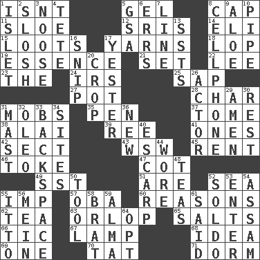 ACROSS 1. Is not 5. Set 8. Head covering 11. A type of plum 12. Indian titles of respect 14. Connecticut Ivy Leaguer 15. Plunders 17. Tall tales 18. Trim (branches) 19. Core 21. Arrange properly for use 22. Area sheltered from the wind 23. Definite Article 24. Big collection agency 25. Plant excrement 27. Cooking vessel 28. Burn to charcoal 31. Crowds into 35. Fenced enclosure 37. Heavy book 38. Mountain range southwest of Kyrgyzstan 39. Portuguese money of account (variant) 41. Washington bills 42. Religious group 43. Compass dir. 45. Monthly bill 46. Casino tip 47. Small bed 49. Fast jet (abbr.) 51. "We ___ not amused" (Victoria) 52. Ocean 55. Mischievous child 57. Chief or king in Benin or Nigeria 60. Thinks logically 62. Beverage made from leaves 63. Fourth or lowest deck 65. Table seasonings 66. Nervous spasm 67. Desk light 68. The content of cognition 69. Single 70. Make lace 71. Dormintory (informal) DOWN 1. Small island 2. Splash clumsily 3. Trap for birds or small mammals 4. Wig 5. Girls' org. (abbr.) 6. Blunders 7. Actor's bit 8. Portable communications device 9. Medicinal plant 10. Corncob 13. Fast planes 16. Sever or remove by pinching or nipping 17. Next before 20. Riding implement 26. Thespian 29. So be it 30. Relief 31. Vertical spar for supporting sails 32. Margarine 33. Keyboard key 34. Settings 36. ___ Haven, CT 40. Fortification 44. Had on 48. Afternoon social gatherings 50. Utensil 52. Twentieth part of a lira 53. Keyboard key 54. Indian state 55. "Tell ____ the Marines!" 56. Chow _ 58. Naughty child 59. _ mater 61. Alleged 64. Elect