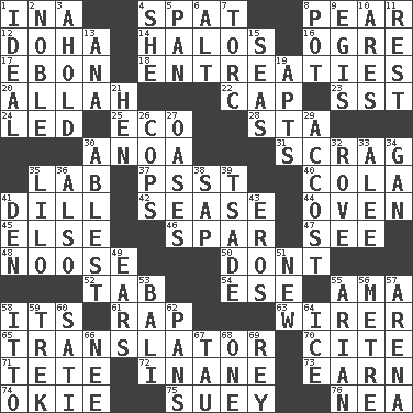 ACROSS 1. _ tizzy (2 wds.) 4. Argument over a trivial matter 8. Lightbulb-shaped fruit 12. Capital of the state of Qatar 14. Rings 16. Legendary monster 17. Inky black, to poets 18. Pleas 20. Assad's deity 22. Head covering 23. Fast jet (abbr.) 24. Directed 25. Environmental prefix 28. R.R. building 30. Small Philippine buffalo 31. Lean end of the neck 35. Experiment locale 37. Inconspicuous attention getter 40. Root beer relative 41. Deli pickle 42. Gospel singer Marvin 44. Baking chamber 45. Otherwise 46. Coast Guard woman 47. Perceive with the eye 48. Trap for birds or small mammals 50. Do not 52. Bar bill 54. Compass dir. 55. Wet nurse (var.) 58. It is 61. Strike 63. One who wires 65. Interpreter 70. Quote 71. False hair 72. Lacking in sense or substance 73. Merit 74. Migrant worker of the '30s 75. Chop _ 76. Teachers' org. DOWN 1. Perfect 2. Impressive in appearance 3. Hold, grip (Informal) 4. A female animal or person 5. Baking dish 6. Keyboard modifier key 7. Torque (variant) 8. Cooking vessel 9. Armor plate that protects the chest 10. Ancient Greek god of war 11. Relief 13. Santa ___, CA 15. Oceans 19. Tenement units (abbr.) 21. Layer 26. 911 reaches them 27. Fertile tracts in a desert 29. Buttonhole 30. Most capable 32. Be footloose 33. Toward shelter 34. Separate the seeds from cotton 35. _ and Stitch 36. In addition 38. Plant excrement 39. Sadhe (variant) 41. Lair 43. Greek god of love 49. Hearing organs 51. ___ Haven, CT 53. Indonesian resort city 55. Believer in; advocate of (suffix) 56. Distance measurement (Brit.) 57. Sports stadium 58. "Tell ____ the Marines!" 59. Long journey 60. Suttee (variant) 62. Zero-star reviews 64. Frozen water 66. Born 67. The 19th letter of the Greek alphabet 68. Single 69. Marina Del _, California