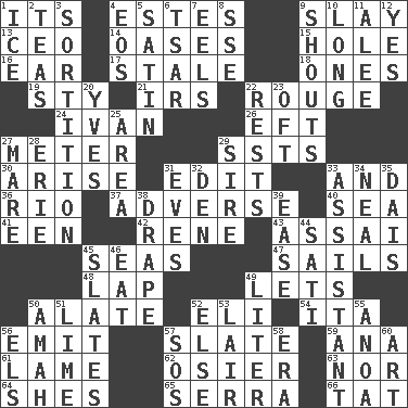 ACROSS 1. It is 4. _____ Park, CO 9. Kill 13. Corporate head (abbr.) 14. Fertile tracts in a desert 15. Hollow 16. Ewer handle 17. Lacking originality or spontaneity 18. Singles 19. Filthy place 21. Big collection agency 22. Makeup applied to the cheeks 24. "Terrible" tsar 26. Bank Draft (abbr.) 27. Distance measurement 29. Fast planes 30. Originate 31. Prepare for publication 33. Also 36. River (Sp.) 37. Contrary to your interests or welfare 40. Ocean 41. Car or cant ending 42. French philosopher Descartes 43. Slender Brazilian palm 45. Oceans 47. Moves on water 48. Pet locale 49. Allows 50. Having winglike extensions 52. Biblical high priest 54. Call ___ day 56. Give off 57. Chalkboard 59. Santa ___, CA 61. Unable to walk 62. Flexible twig of a willow tree 63. Not either 64. "______ My Girl" (Turtles hit) 65. Father Junipero _ 66. Make lace DOWN 1. Frozen water 2. Beverages made from leaves 3. Drawing lots 4. Greek goddess of the dawn 5. Smooth fabric 6. Russian ruler of old 7. Snakelike fish 8. Compass dir. 9. Yells 10. Having great length 11. Toward shelter 12. Consenting reply 20. Jacques Cousteau's middle name 22. Musical pauses 23. Often (poetically) 25. Type of rug 27. Female horse 28. 4th largest of the Great Lakes 29. The founder of a family 31. Nights before holidays 32. Lair 33. Helper 34. Actress Patricia 35. Raised platform 38. Window treatment 39. Comfort 44. Suttee (variant) 45. Chalkboards 46. Erode 49. 61 cubic inches 50. Nursemaid 51. Citrus frut 52. Otherwise 53. Den 55. Small Philippine buffalo 56. Raised railways 57. Mayday 58. Period 60. Tate display